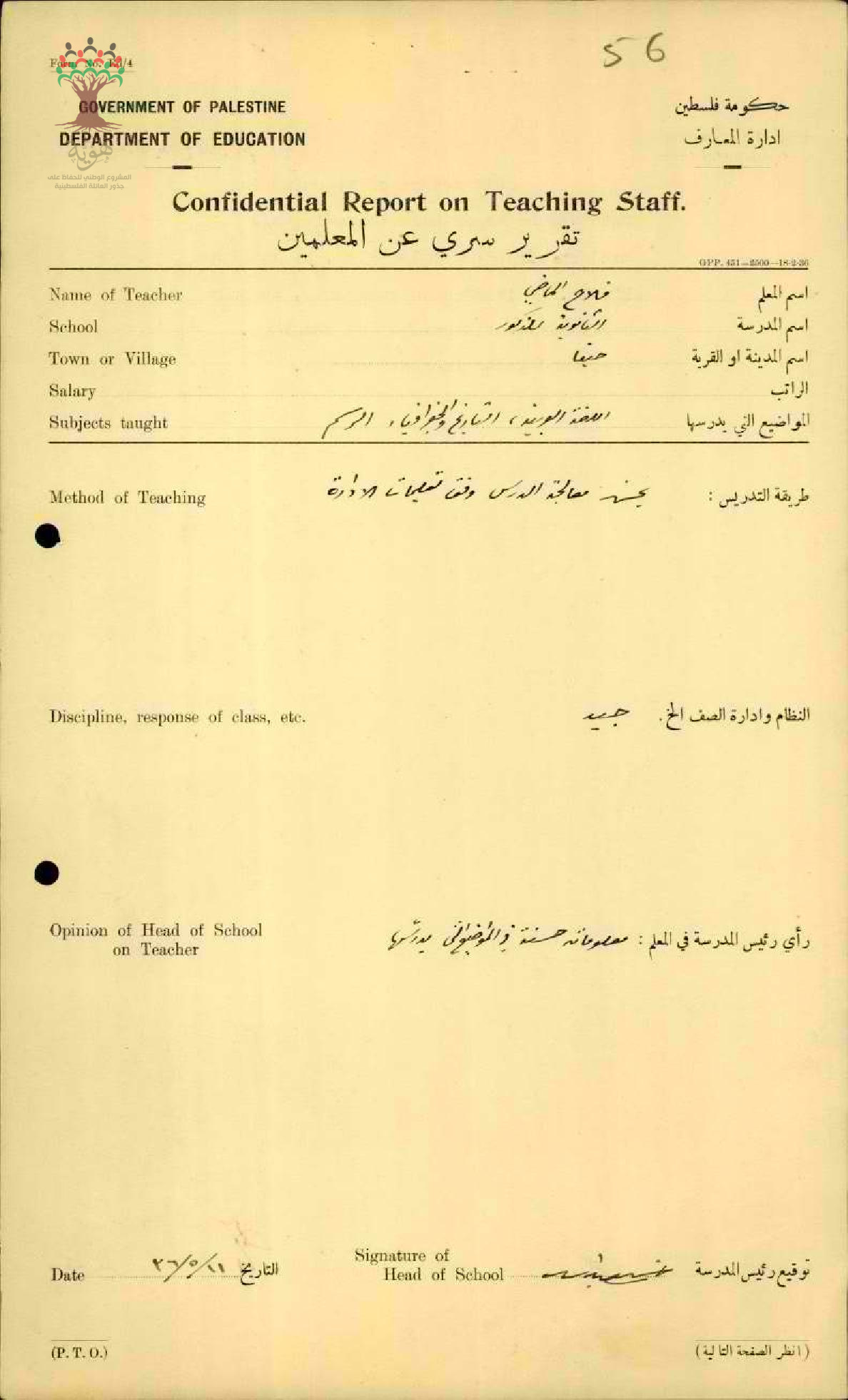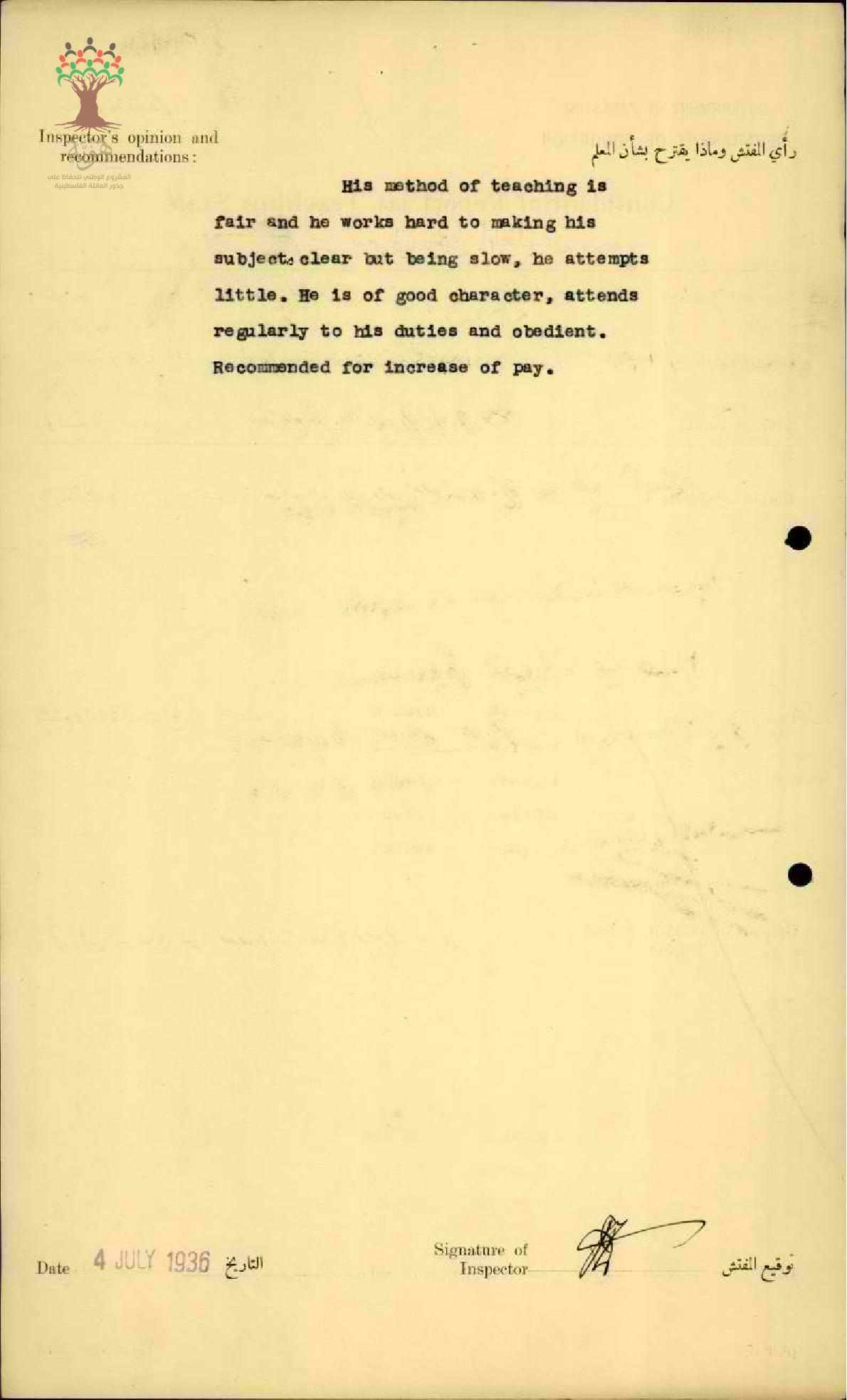 تقرير تفصيلي عن أداء المعلم فلاح الماضي في مدرسة بيسان سنة 1936