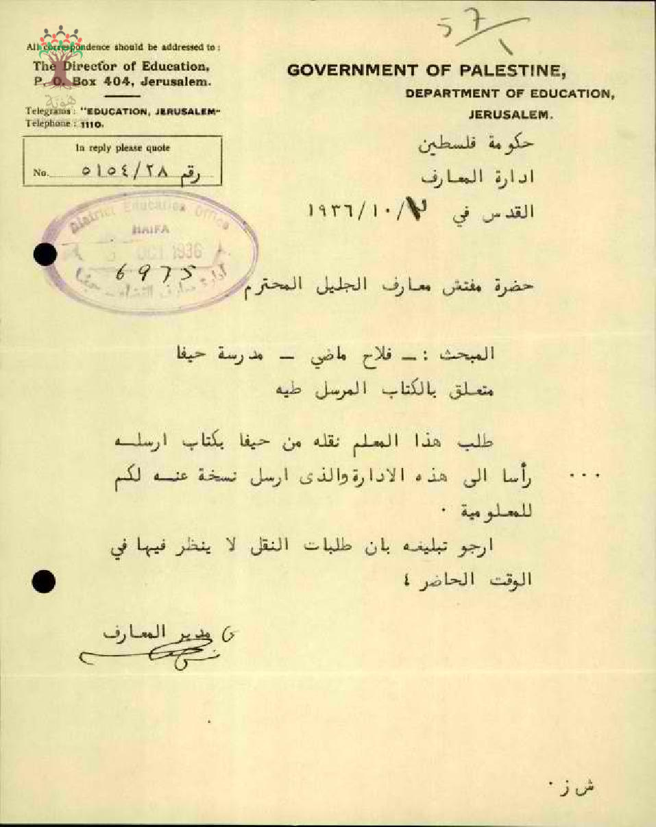 رسالة من مدير المعارف الى مفتش المعارف ليخبر المعلم فلاح الماضي بعدم امكانية نقله