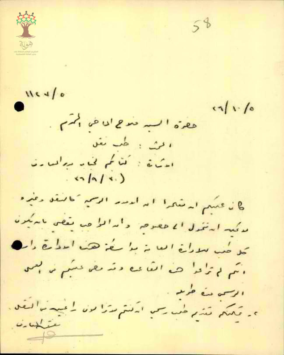 رسالة من مفتش المعارف الى المعلم فلاح الماضي بخصوص قوانين المراسلة في دائرة المعارف