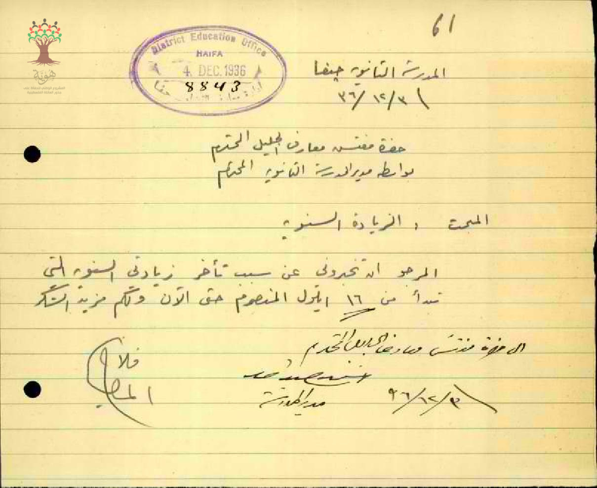 رسالة من المعلم فلاح الماضي الى مفتش المعارف يسأل عن سبب تأخر زيادته السنوية