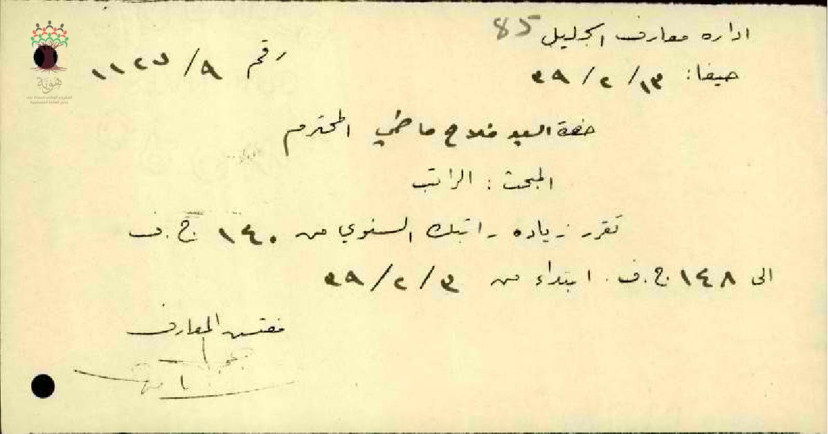 رسالة من مفتش المعارف الى المعلم فلاح الماضي بخصوص زيادة راتبه السنوية