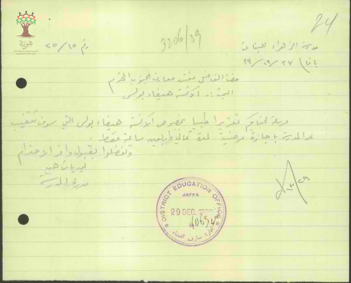 رسالة من مديرة مدرسة الزهراء للبنات إلى مفتش معارف الجنوب بخصوص إجازة مرضية مدتها ثمانية وأربعون ساعة للمعلمة هيفاء بولس