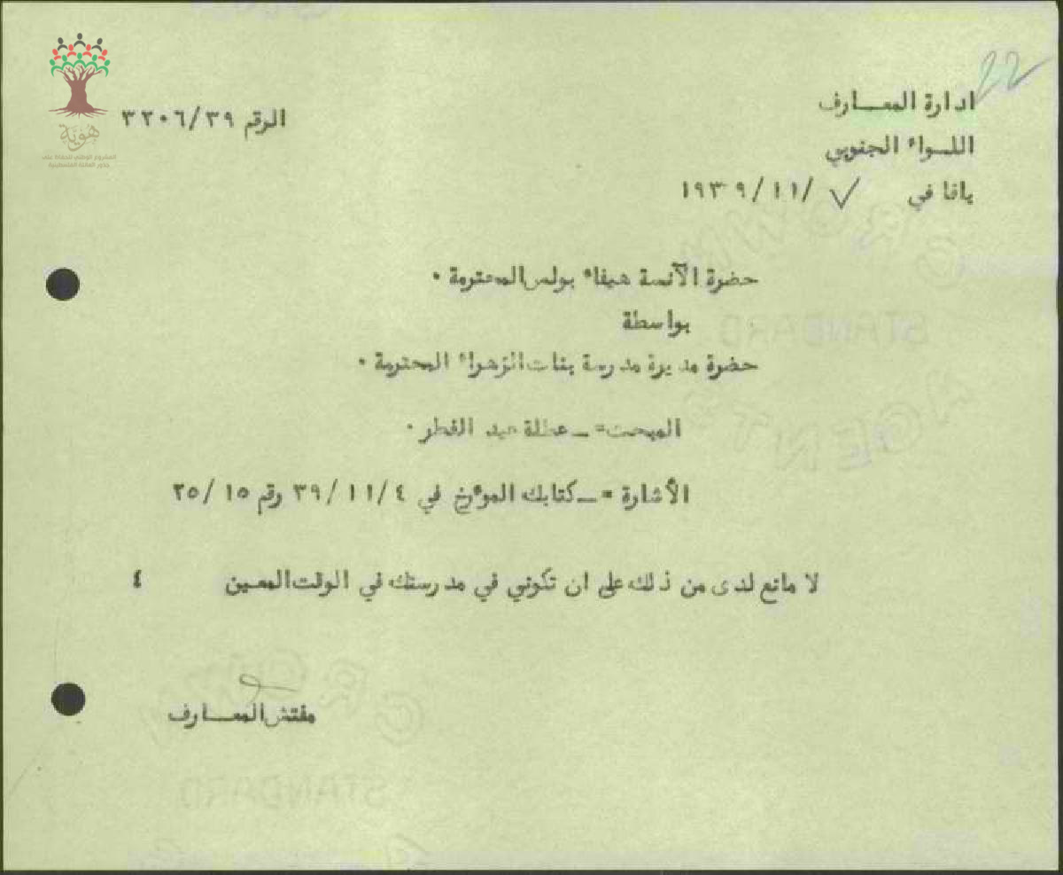 رسالة من مفتش معارف الجنوب إلى المعلمة هيفاء بولس بخصوص عطلة عيد الفطر
