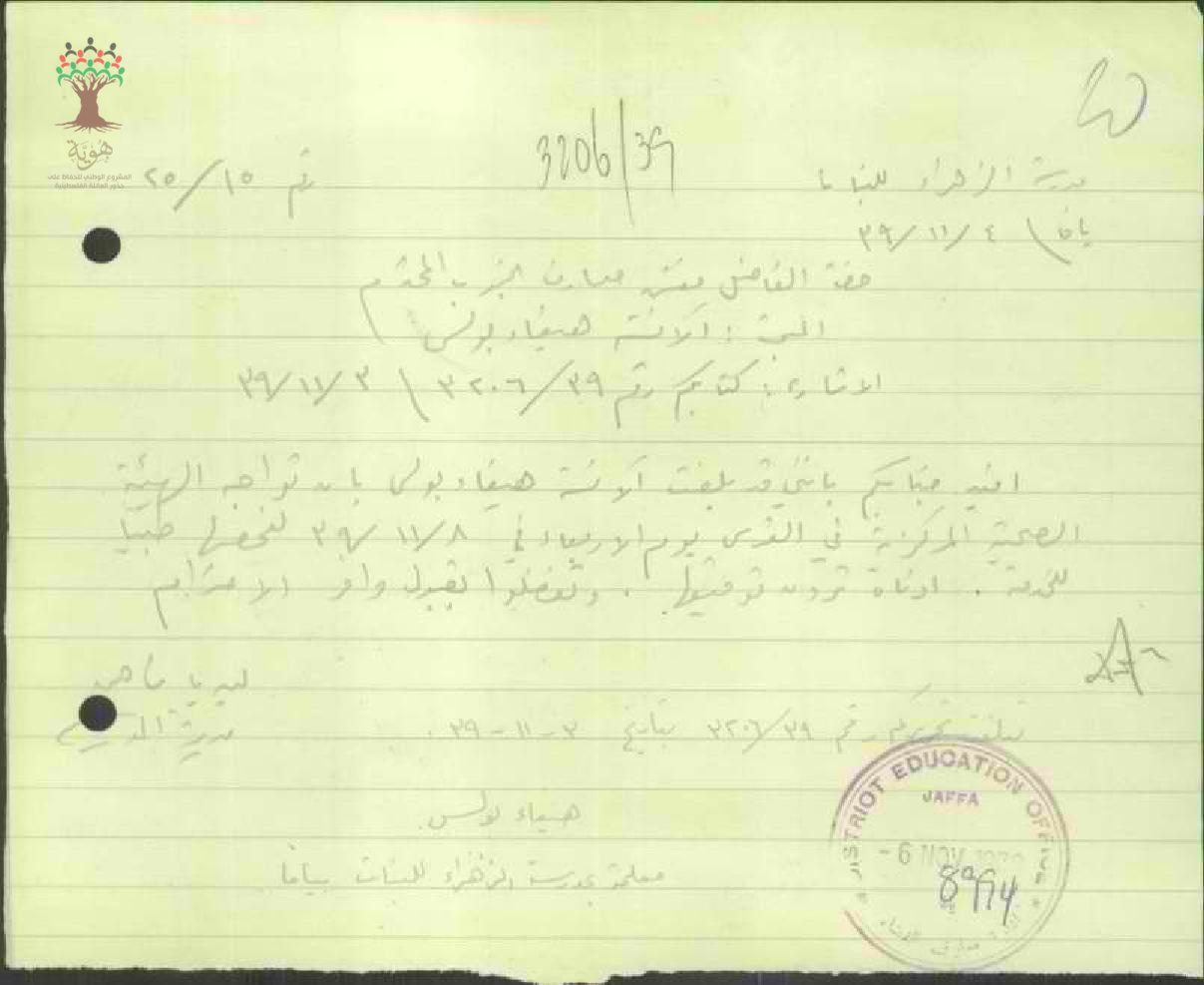 رسالة من مديرة مدرسة الزهراءللبنات إلى مفتش معارف الجنوب بخصوص إلى ارسال المعلمة هيفاء بولس للعرض على اللجنة الطبية