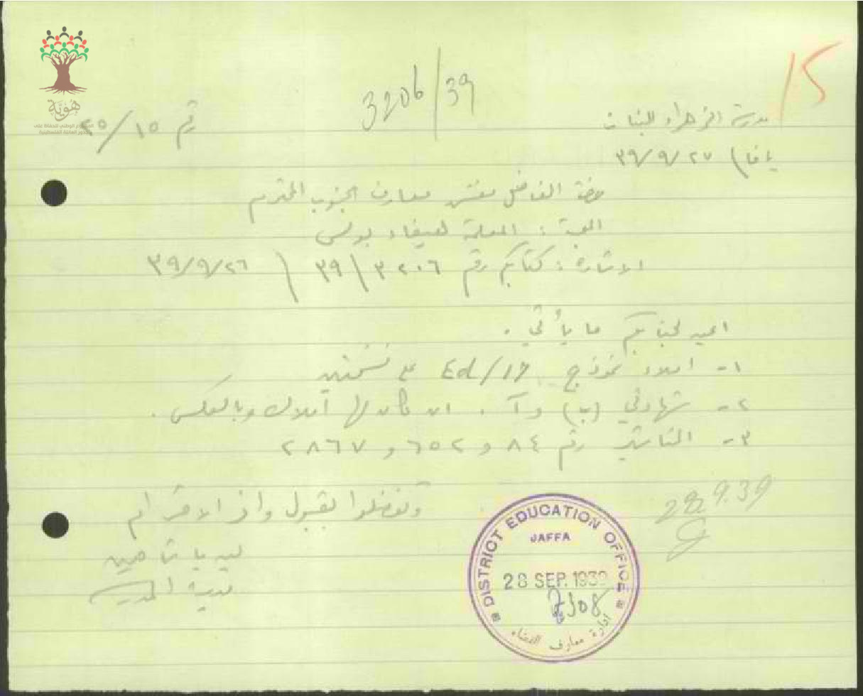 رسالة من مديرة مدرسة الزهراء للبنات إلى مفتش معارف الجنوب بخصوص ملئ استماره للمعلمة هيفاء بولس اذا كان عندها املاك