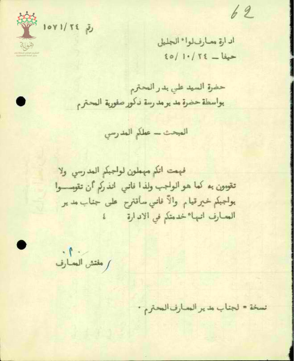 رسالة من مفتش المعارف إلى المعلم علي بدر يبحث معه عمله في المدرسة