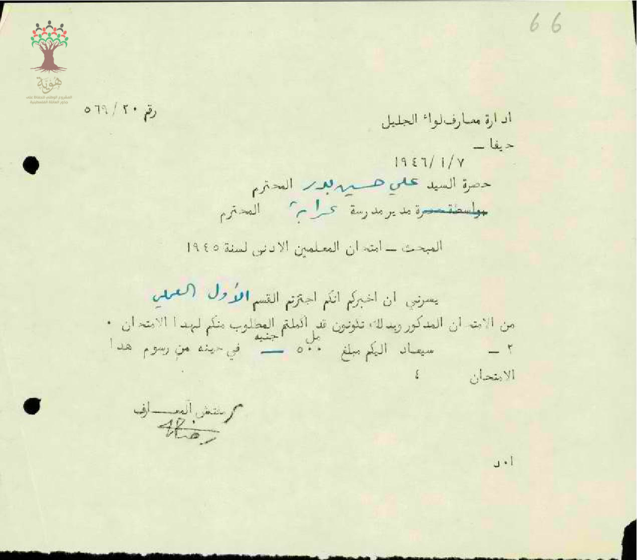 رسالة من مفتش المعارف إلى المعلم علي بدر يخبره بنجاحه في امتحان المعلمين العملي