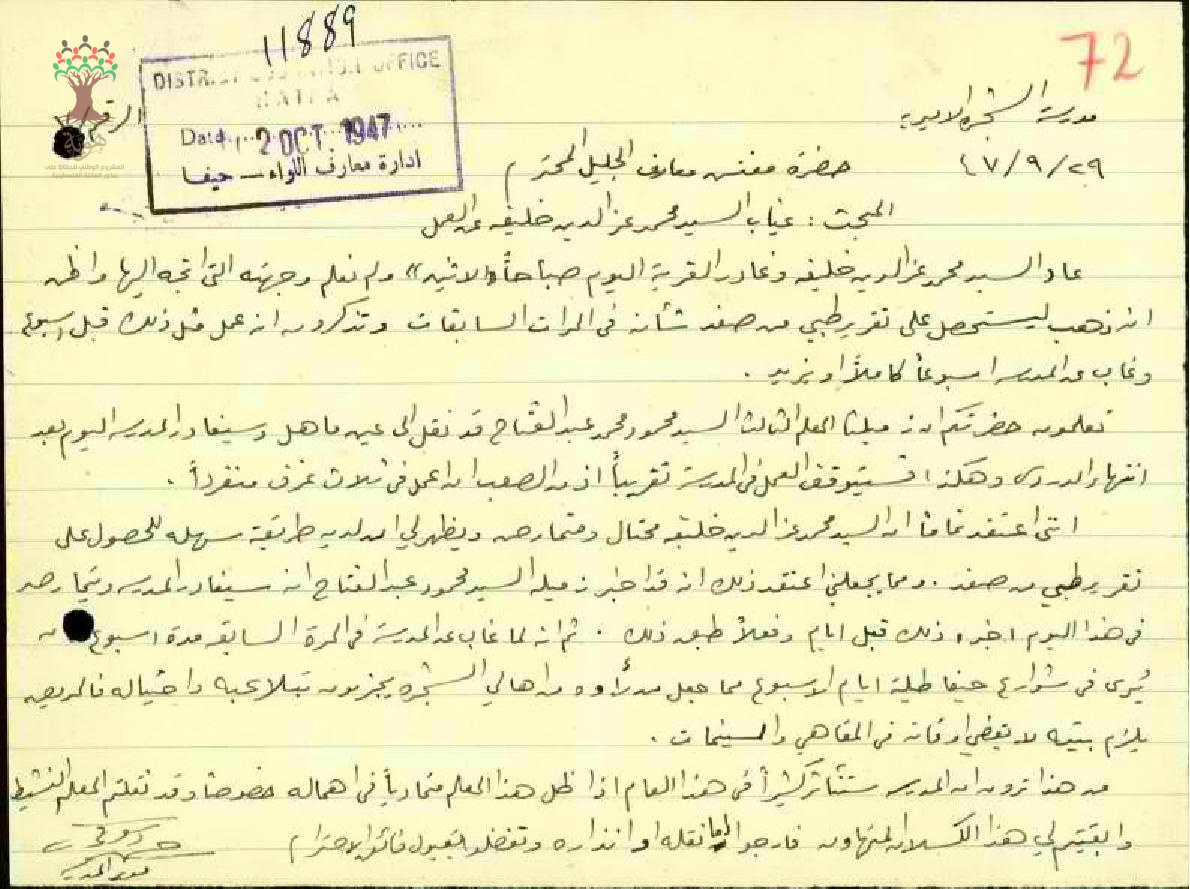 رساله من مدير مدرسه الشجرة الاميرية الى مفتش معارف الجليل بخصوص غياب المعلم محمد عز الدين خليفة عن عمله