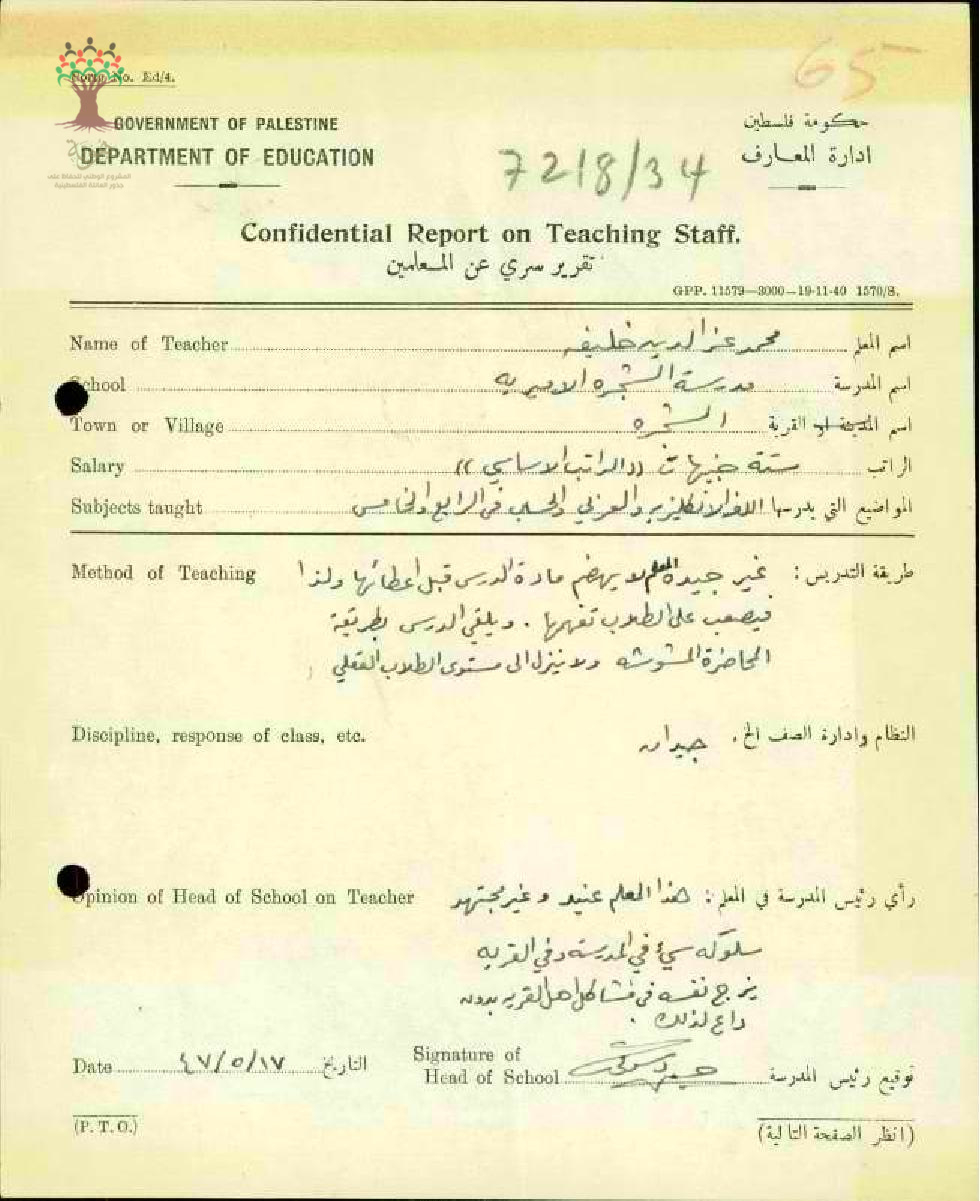 ادارة المعارف تقرير سري عن المعلم محمد عز الدين خليفة