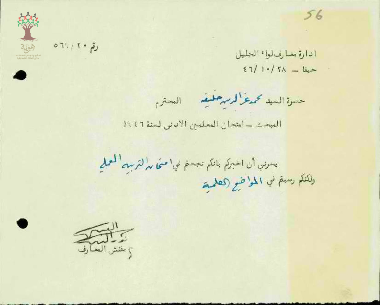 رساله من مفتش المعارف الى المعلم محمد عز الدين خليفة بخصوص نجاحكم في امتحان التربية