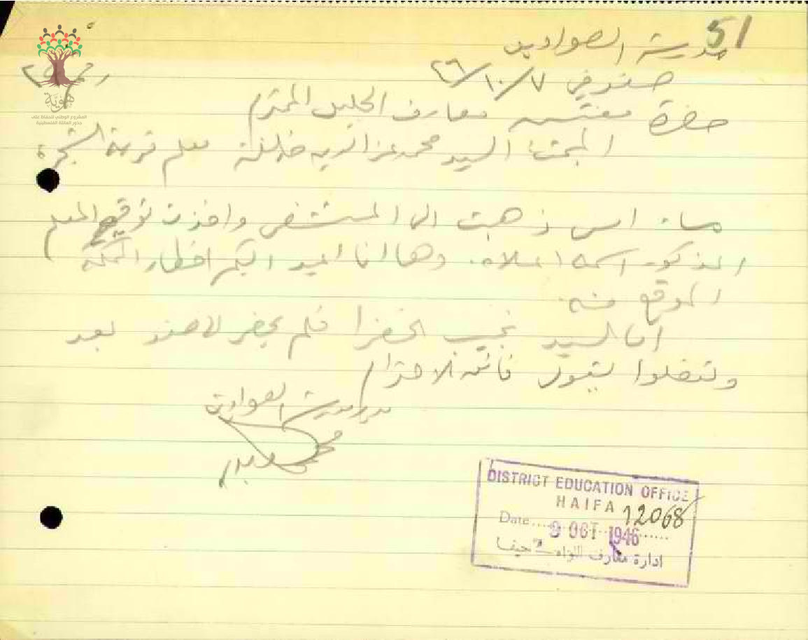 رساله من المعلم محمد عز الدين خليفة الى مفتش معارف الجليل بخصوص الذهاب الى المستشفى واخذ توقيع المعلم المذكور اسمه اعلاه