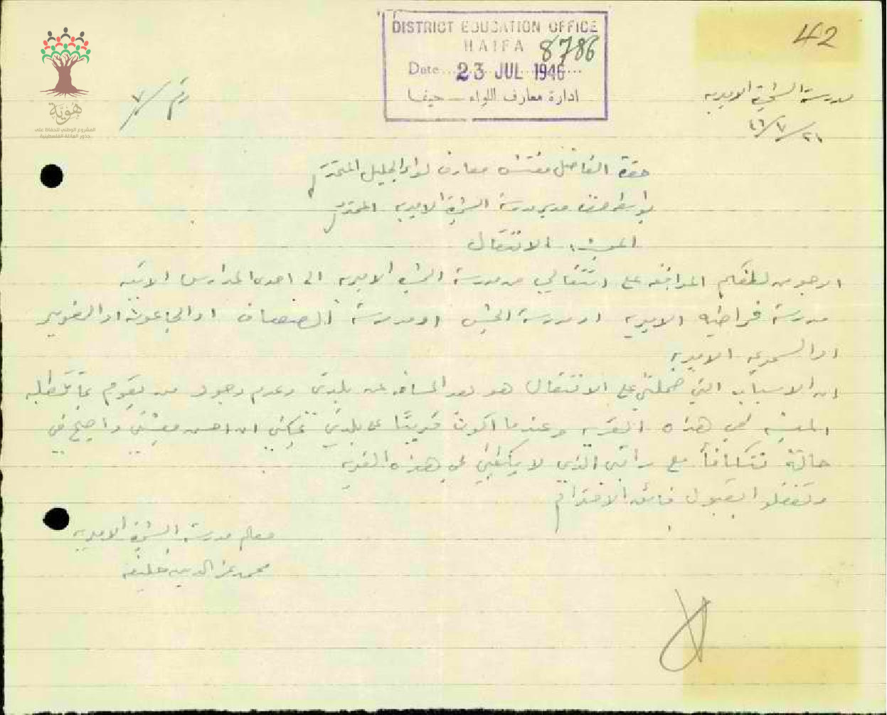 رساله من المعلم محمد عز الدين خليفة الى مفتش معارف الجليل بخصوص طلب نقل من مدرسة الشجرة الاميرية الى مدرسة الجش او الى مدرسه الصفصاف او الى مدرسه الجاعونة الاميرية