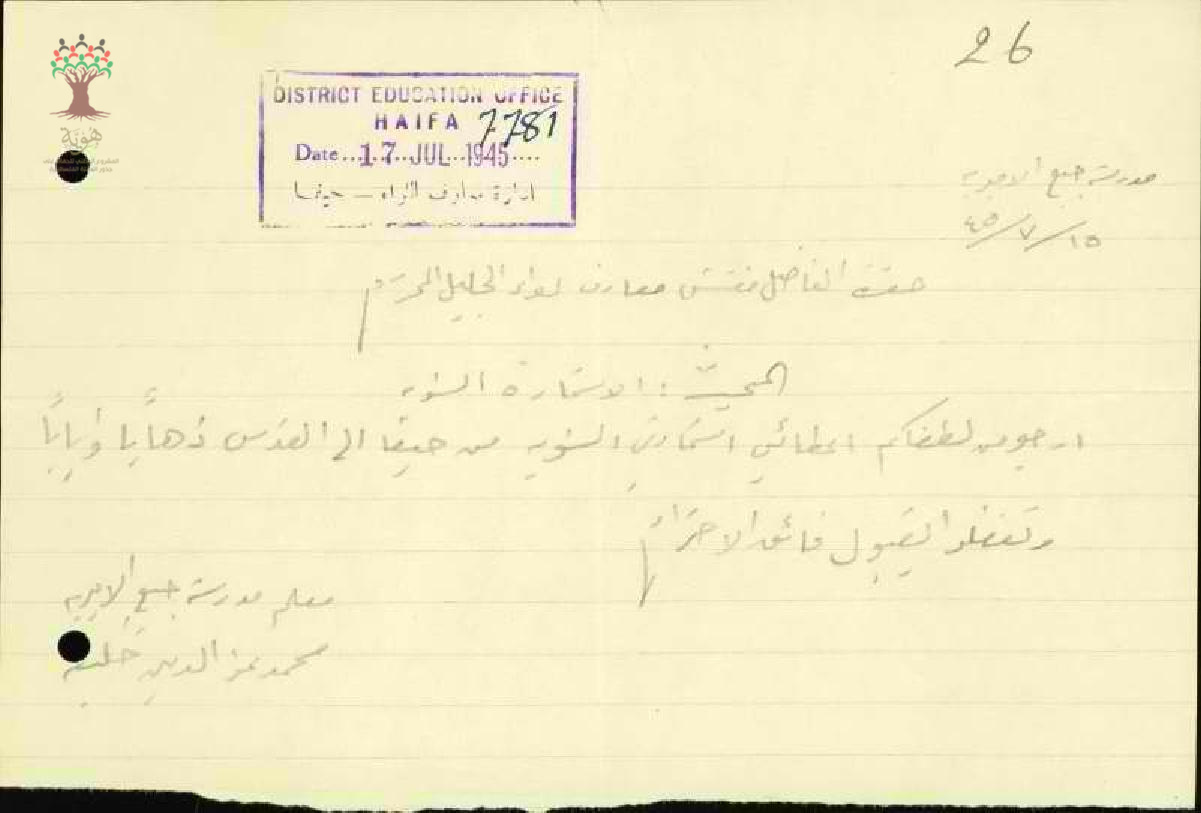 رساله من المعلم محمد عز الدين خليفة الى مفتش معارف الجليل بخصوص اعطائي استمارة السنويه من حيفا الى القدس ذهاب وايابا