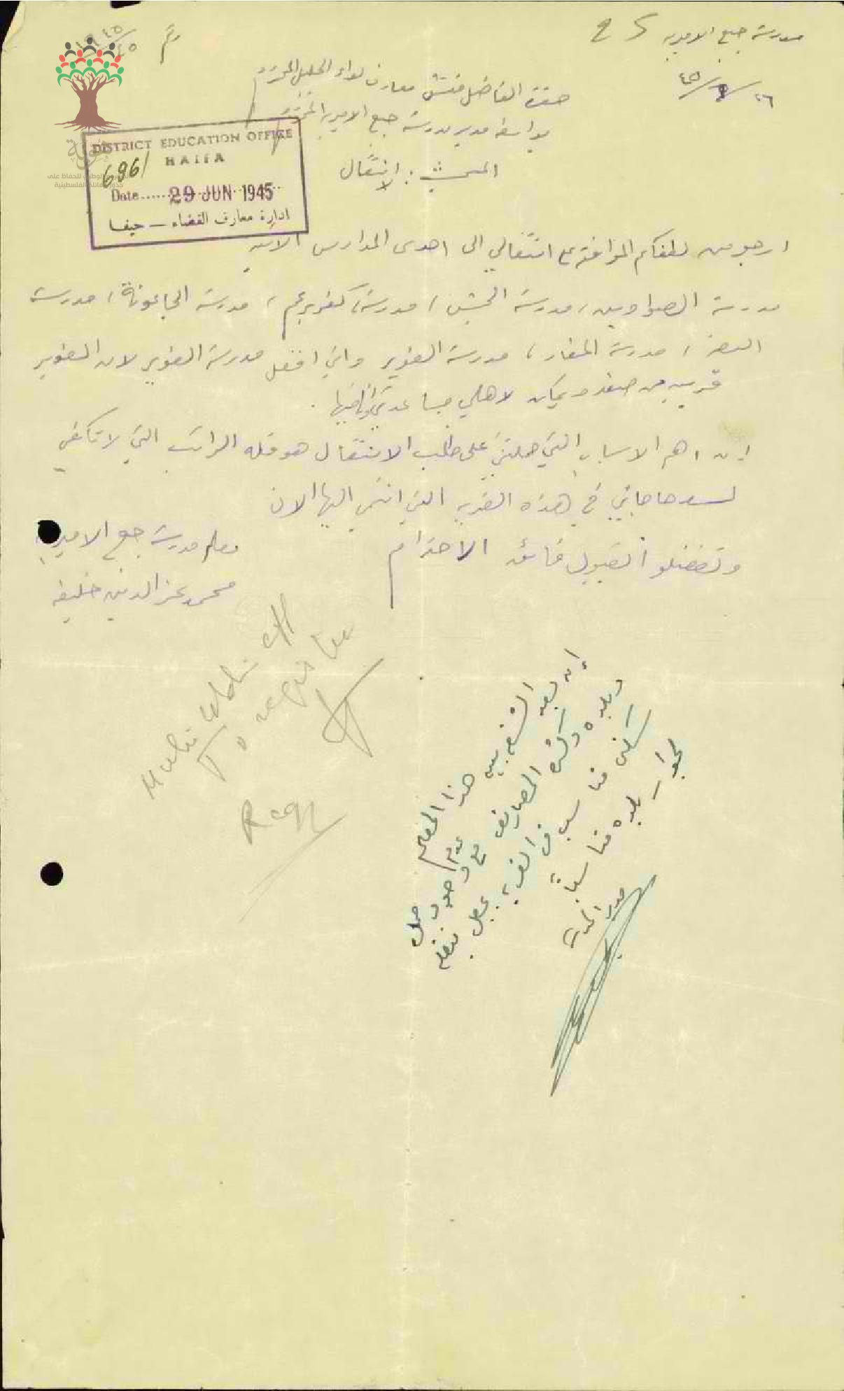 رساله من المعلم محمد عز الدين خليفة الى مفتش معارف الجليل بخصوص طلب نقل الى احد مدارس الاميرية
