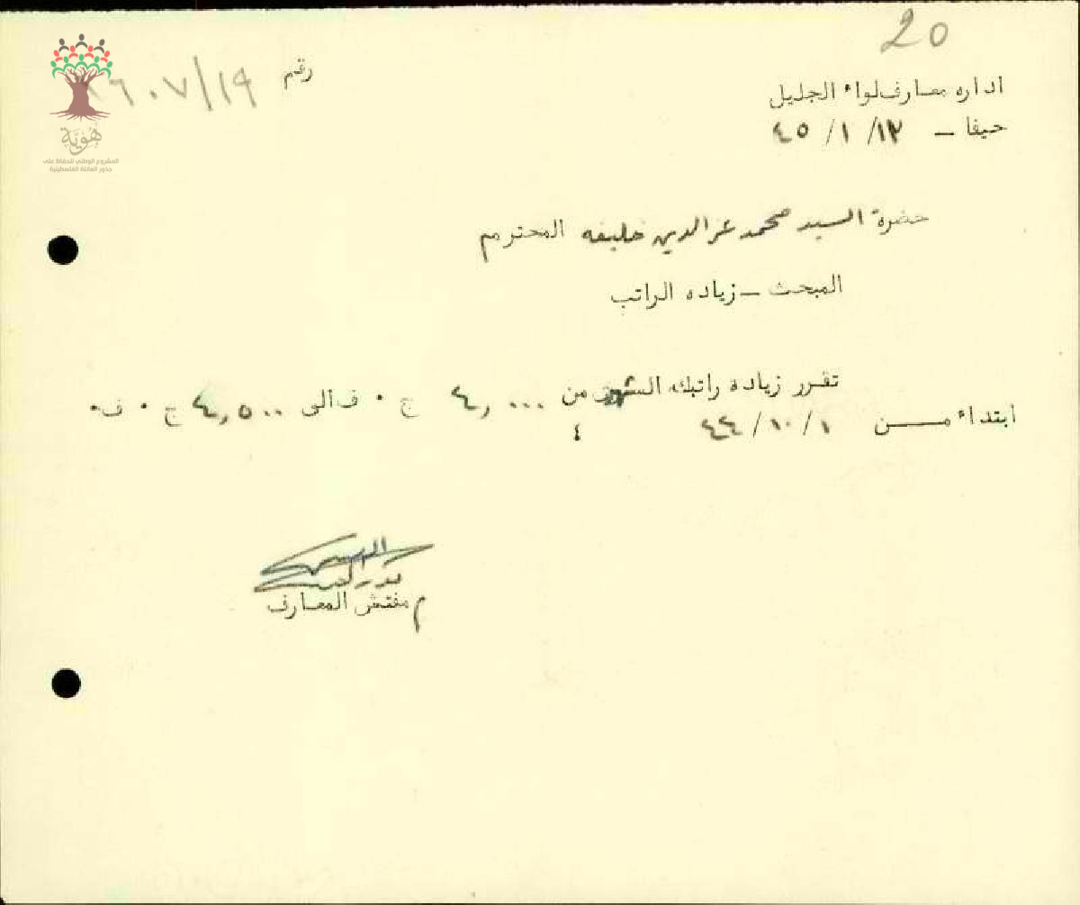 رسالة من مفتش المعارف إلى المعلم محمد عز الدين خليفة بخصوص زيادة الراتب