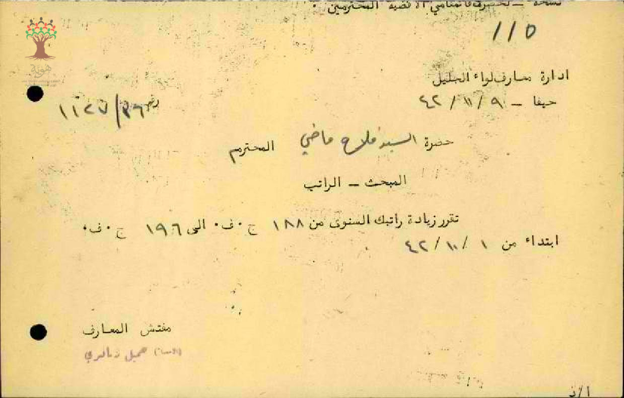 رسالة من مفتش المعارف الى المعلم فلاح الماضي بخصوص زيادة راتبه