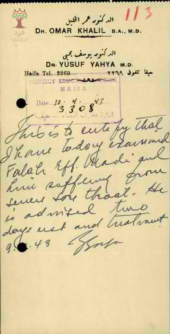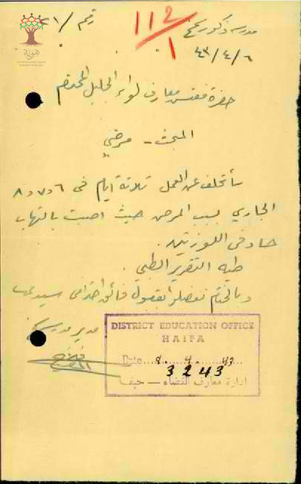 رسالة من المعلم فلاح الماضي الى مفتش المعارف يطلب اجازة مرضية مرفقة بالتقرير الطبي