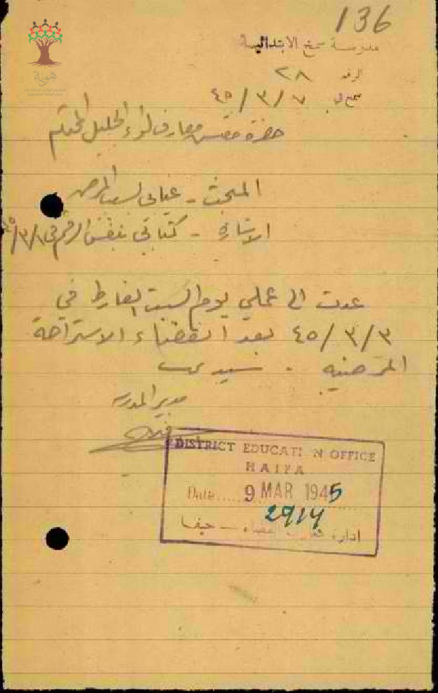 رسالة من المعلم فلاح الماضي الى مفتش المعارف بخصوص عودته الى العمل