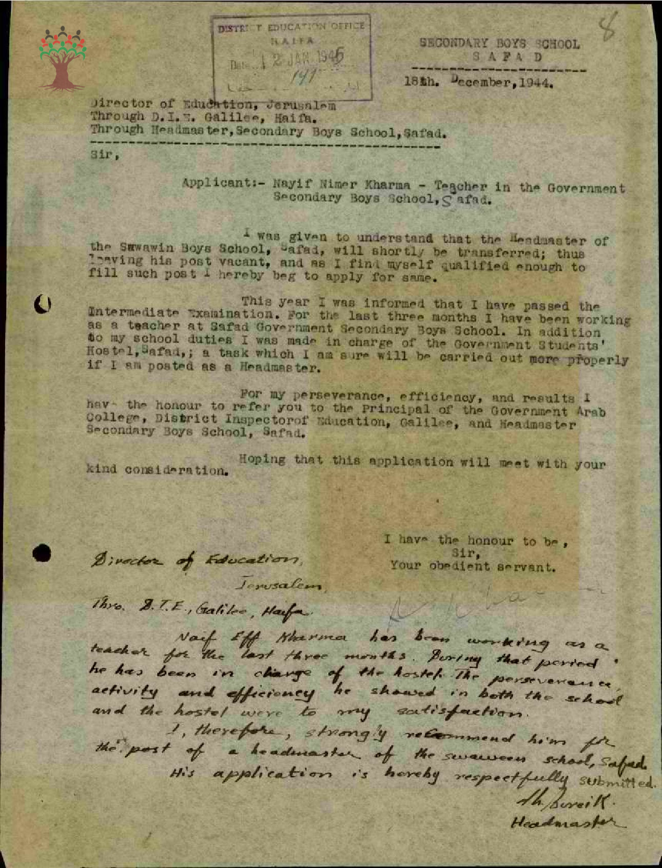 رسالة من المعلم نايف خرما الى مفتش المعارف يطلب نقله من مدرسة صفد