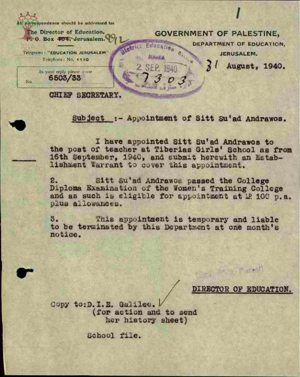 رسالة من مدير المعارف الى رئيس السكرتارية بخصوص تعيين المعلمة سعاد حبيب أندراوس