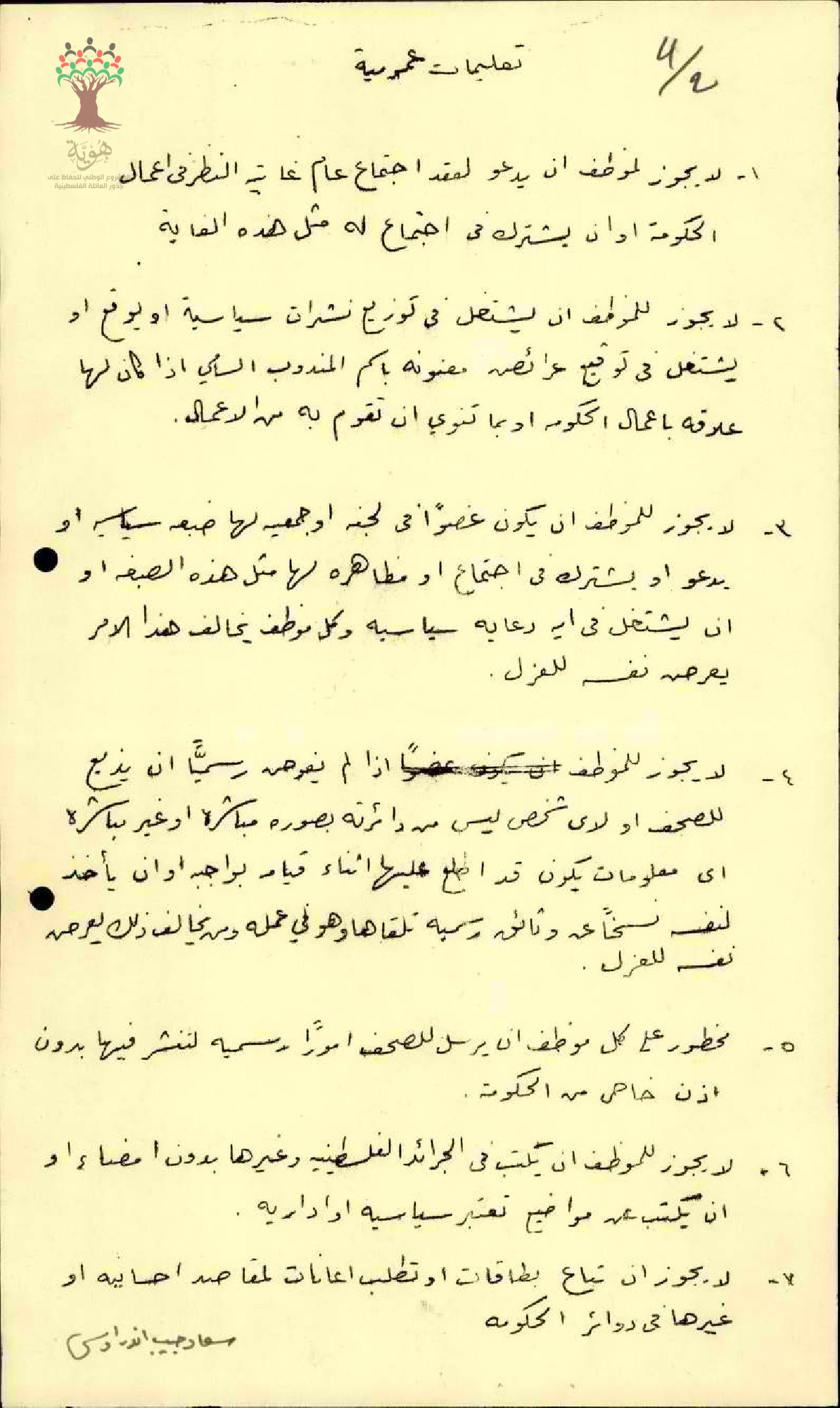 توقيع المعلمة سعاد اندراوس على التعليمات العمومية لإدارة المعارف