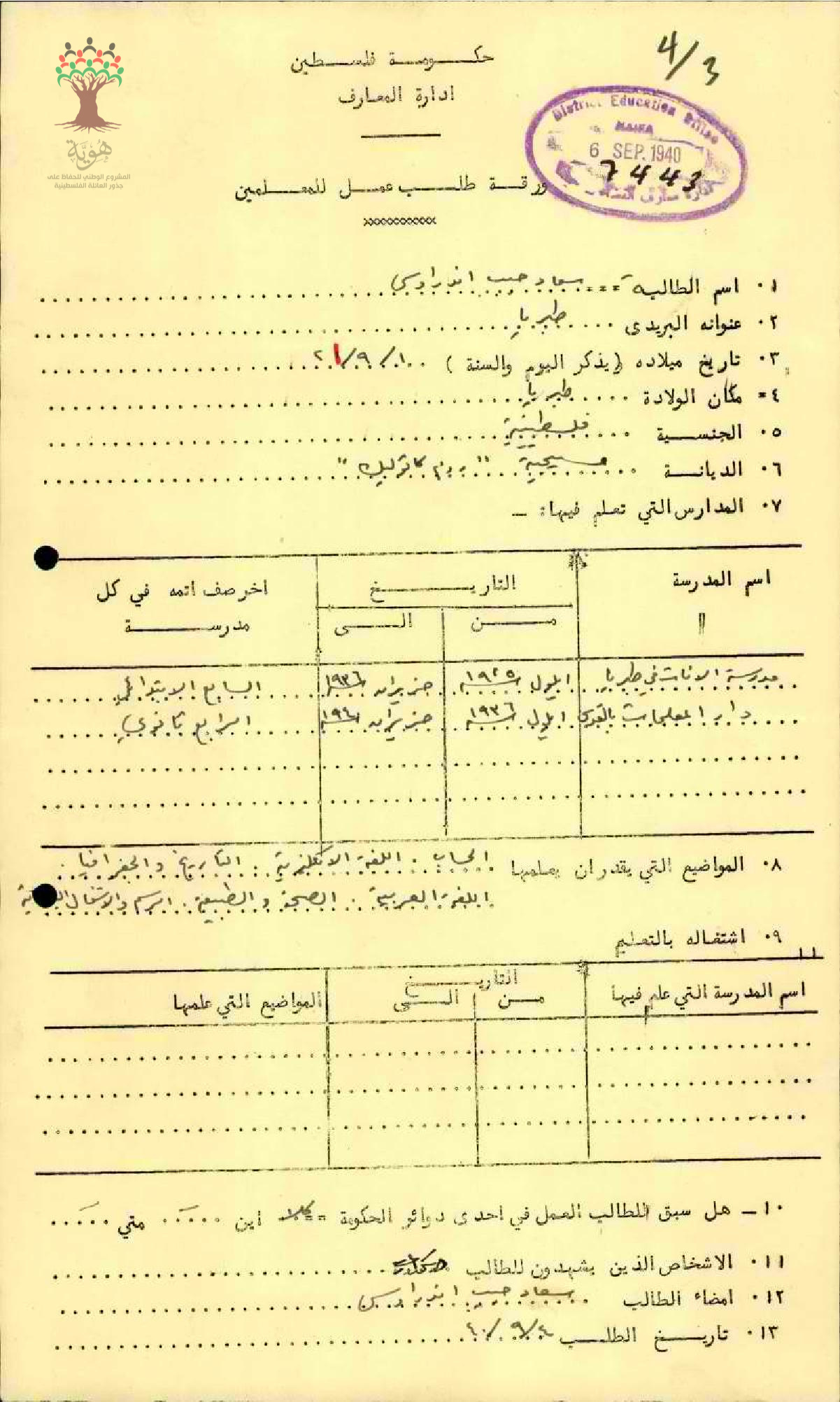 ورقة طلب عمل للمعلمة سعاد اندراوس/طبريا