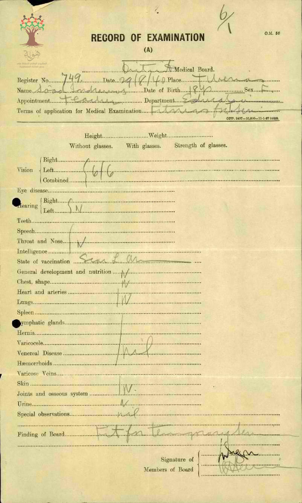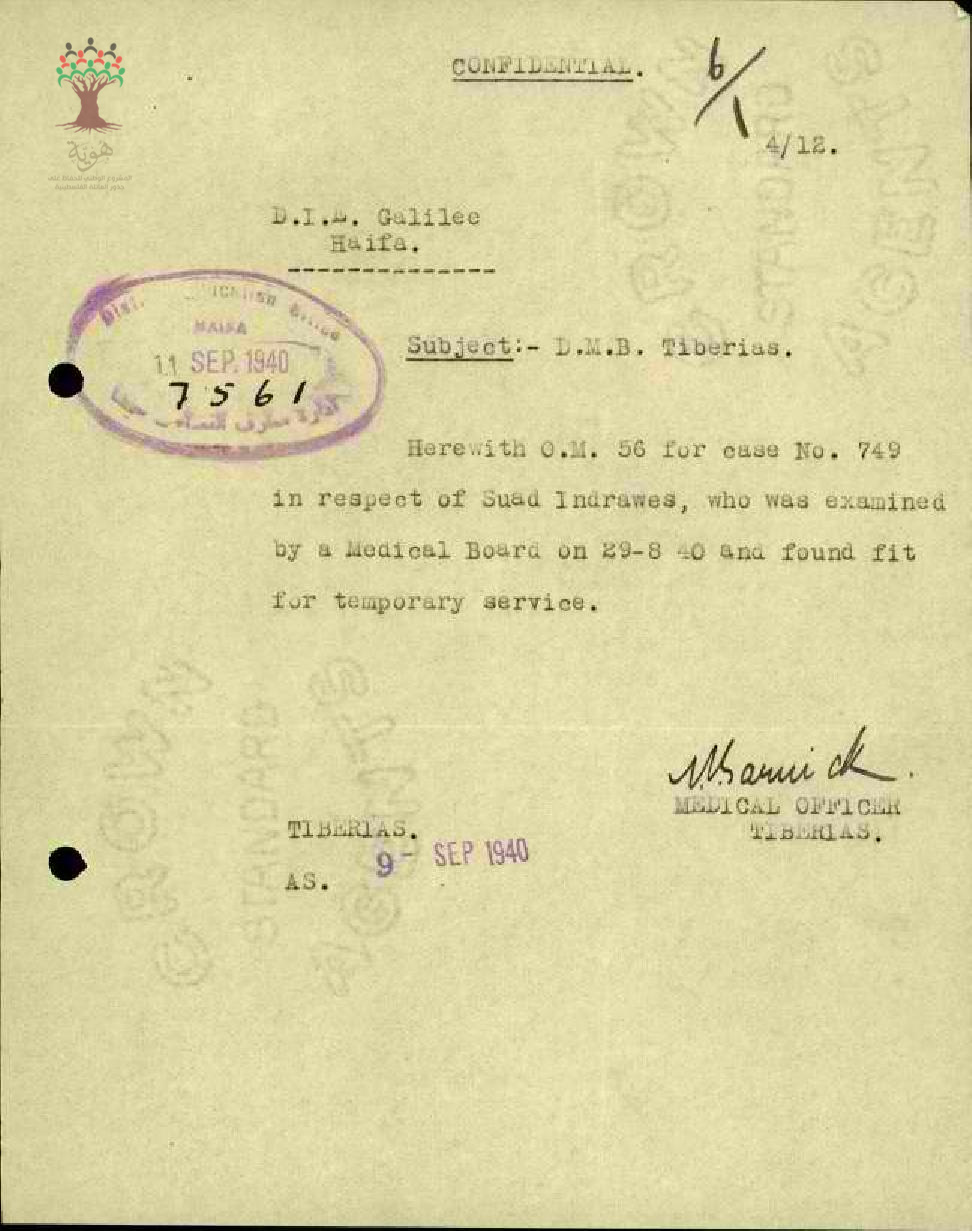 رسالة من رئيس الأطباء الى مفتش المعارف مرفقة بالتقرير الطبي لتعيين المعلمة سعاد اندراوس