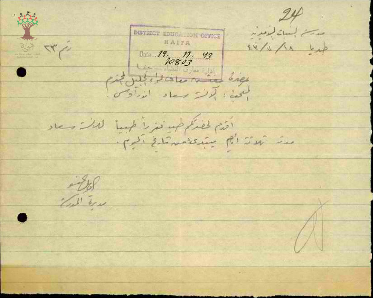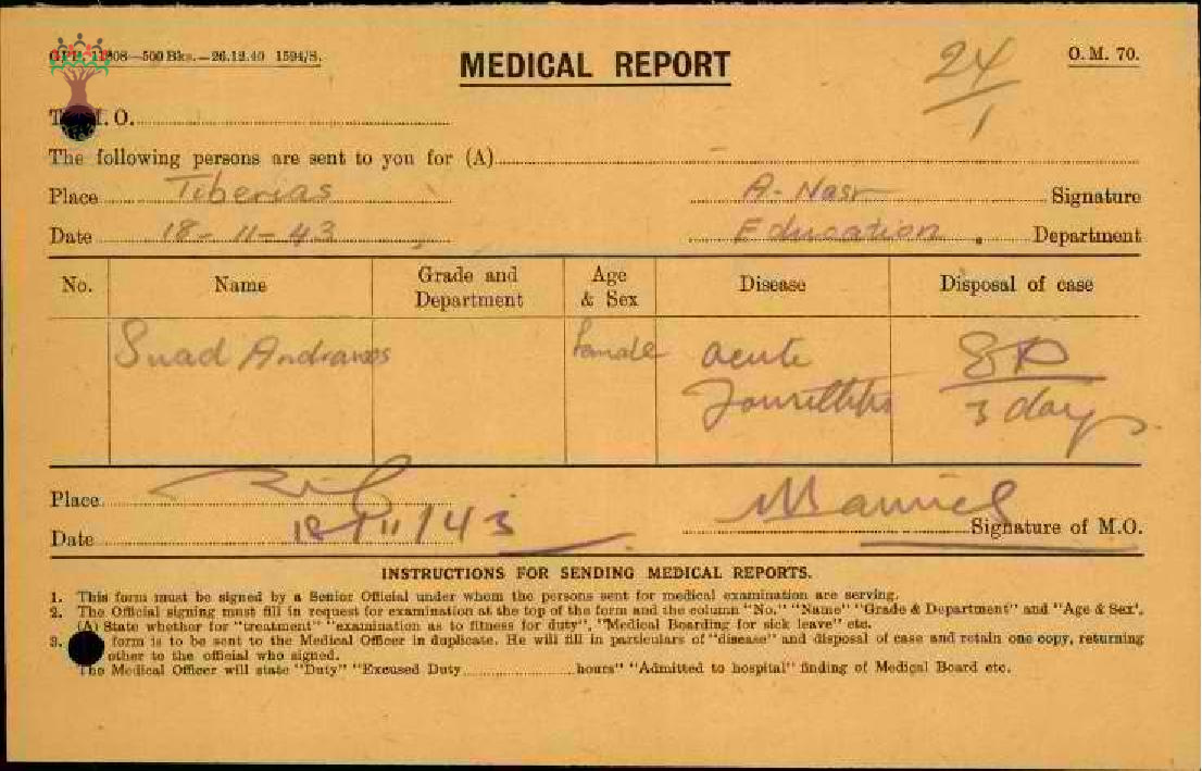 رسالة من مديرة مدرسة طبريا الى مفتش المعارف بخصوص تغيب المعلمة سعاد اندراوس مرفقة بالتقرير الطبي