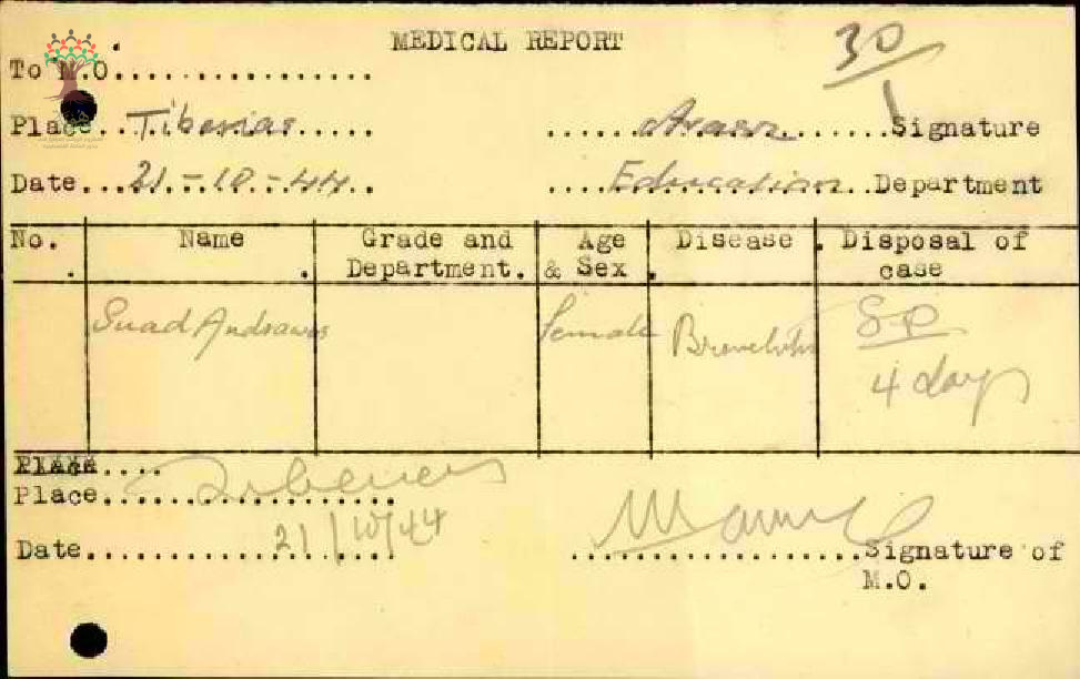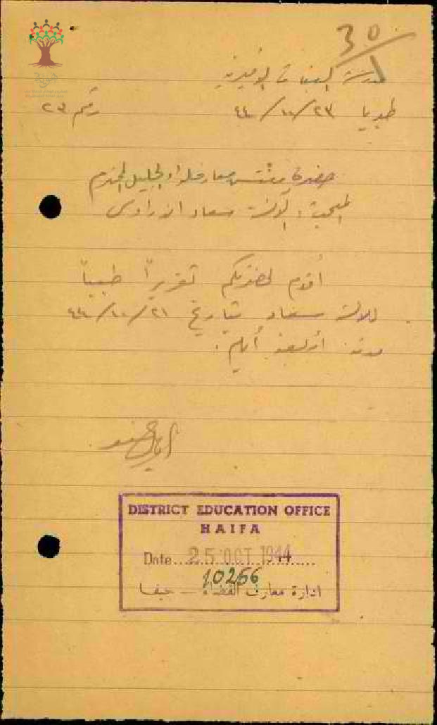 رسالة من مديرة مدرسة طبريا الى مفتش المعارف بخصوص تغيب المعلمة سعاد اندراوس مرفقة بالتقرير الطبي