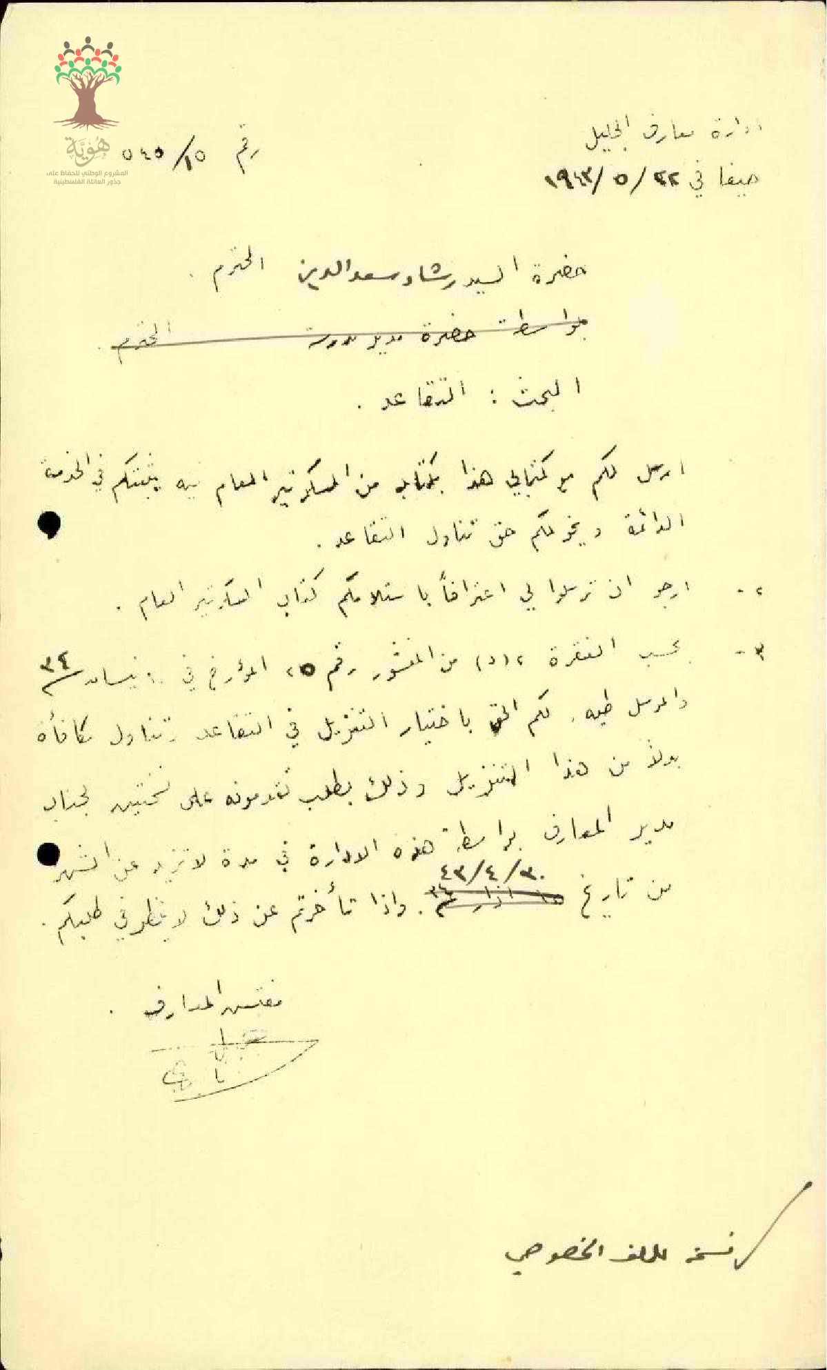 رسالة من مفتش المعارف المعلم رشاد سعد الدين بخصوص التقاعد