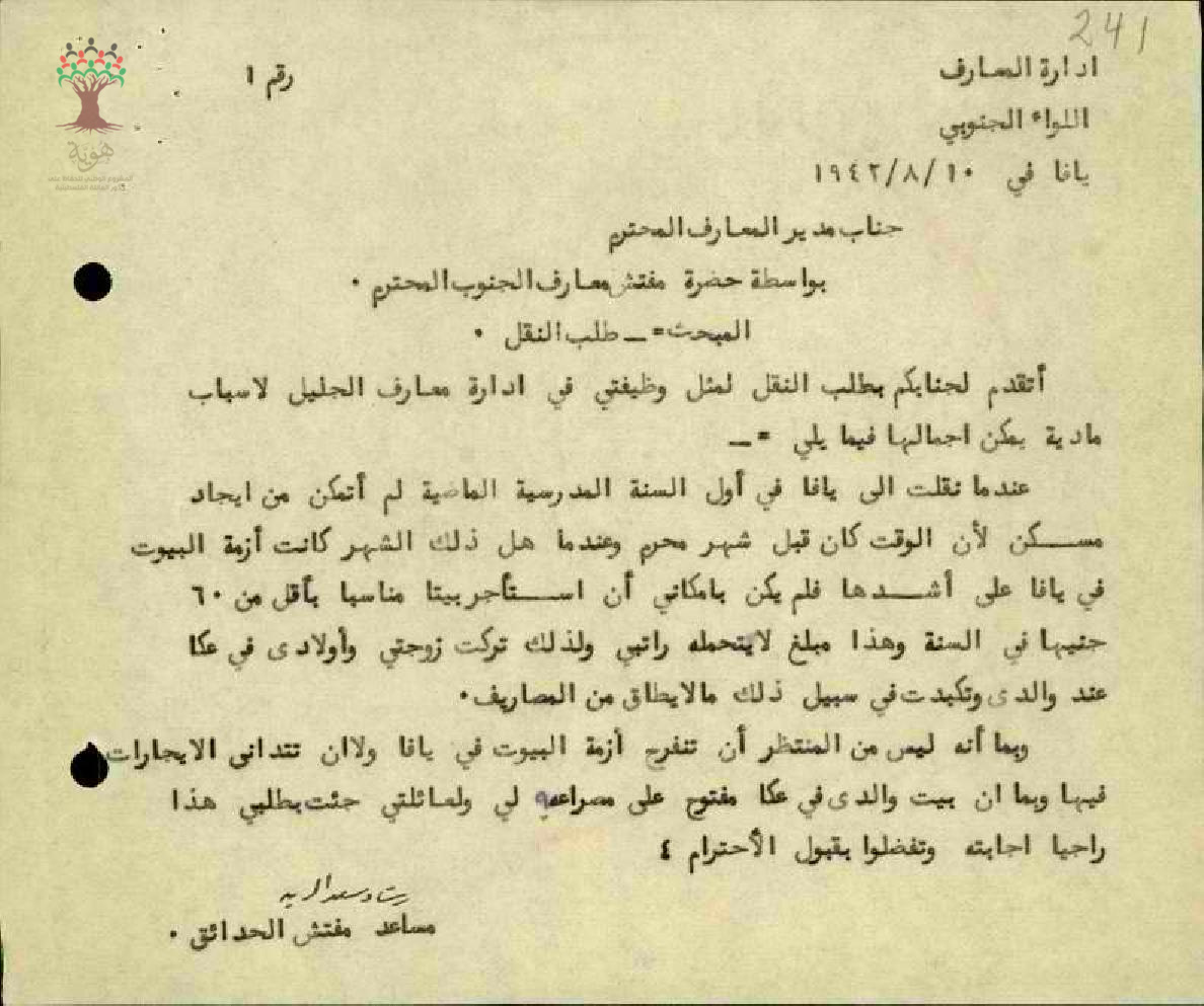 رسالة من مساعد مفتش الحدائق رشاد سعد الدين إلى مدير المعارف بواسطة مفتش معارف الجنوب بخصوص : النقل