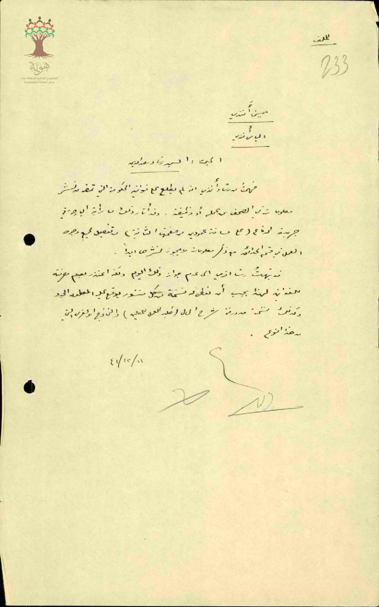 رسالة إلى السيد حسين أفندي وإلياس أفندي بخصوص السيد رشادسعد الدين عن عدم علمه بقوانين العمل وعدم علمه بعدم السماح بنشر أي معلومه في الصحف عن عمله