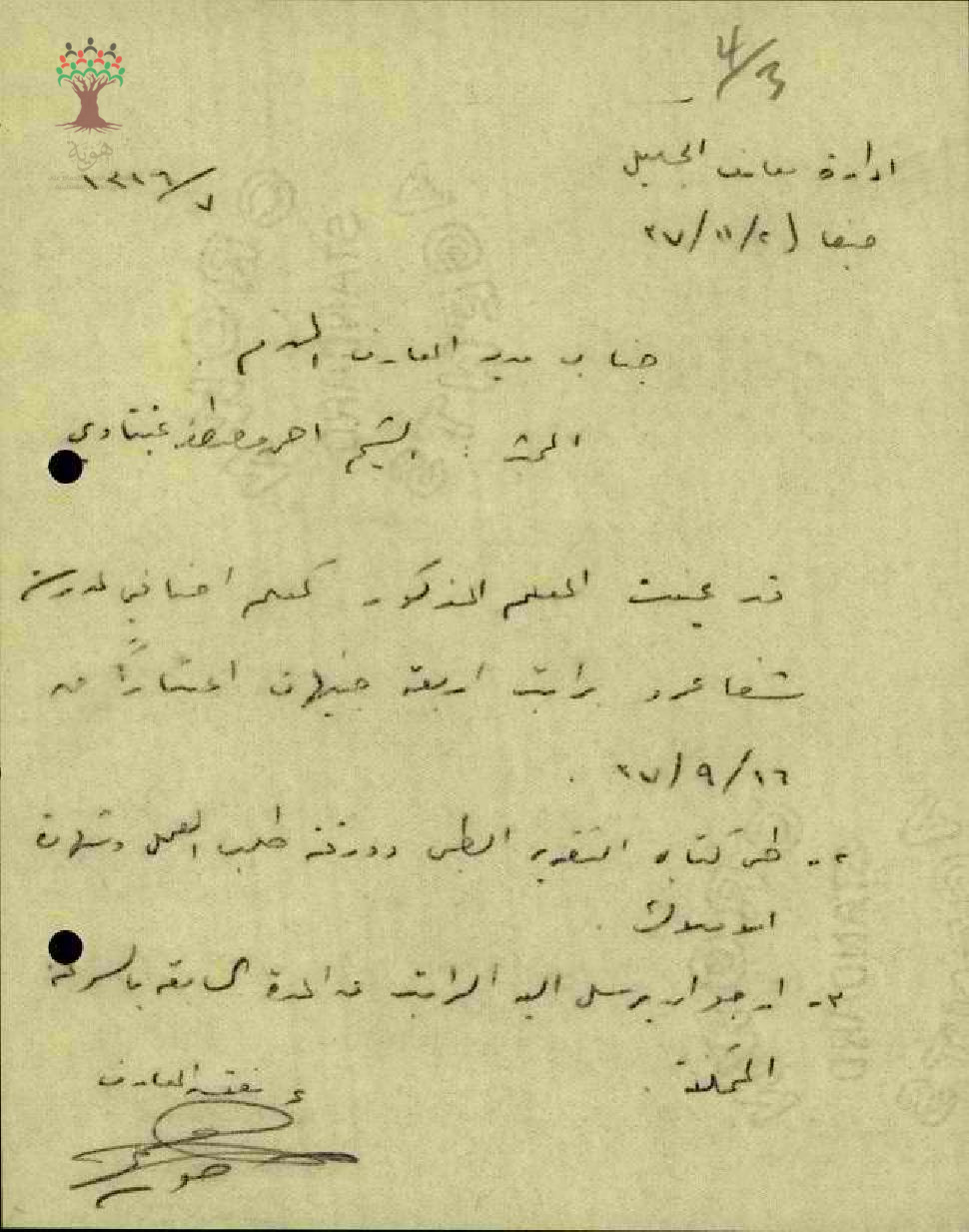 رسالة من مفتش المعارف إلى مدير المعارف يبحث معه تعيين المعلم أحمد عنبتاوي في مدرسة شفا عمرو