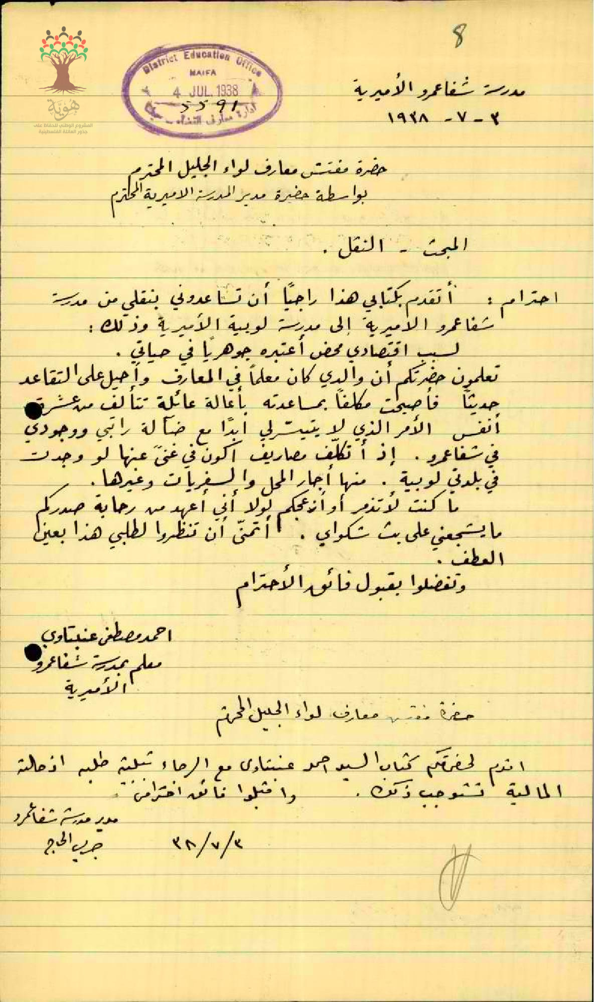 رسالة من المعلم أحمد عنبتاوي إلى مفتش المعارف يطلب نقله من مدرسة شفا عمرو إلى مدرسة لوبيا ذاكراً السبب