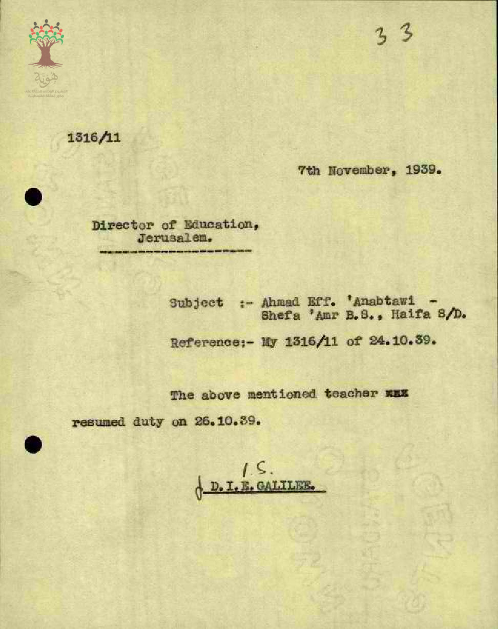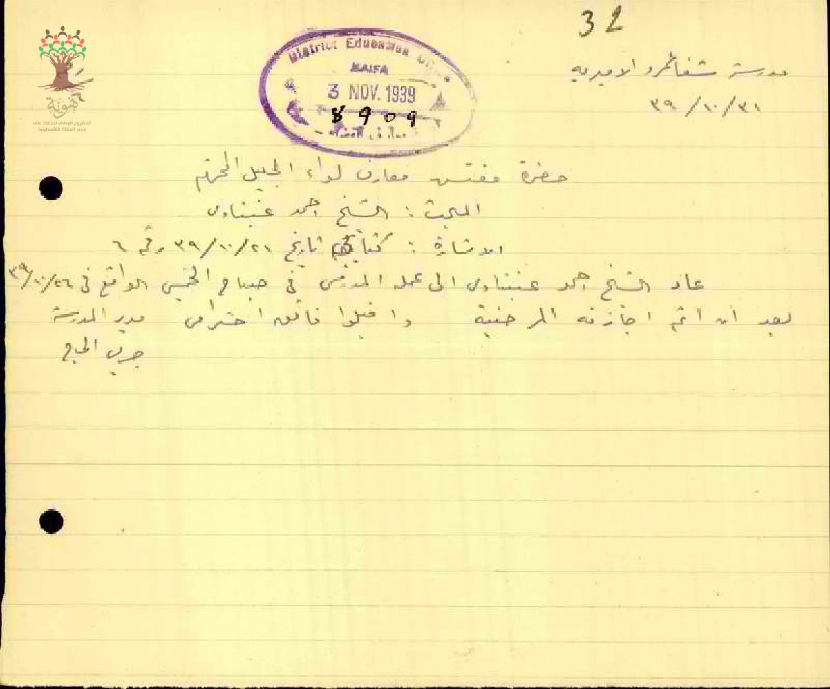 رسالة من مدير مدرسة شفا عمرو إلى مفتش المعارف يخبره بعودة المعلم أحمد عنبتاويإلى العمل ف المدرسة