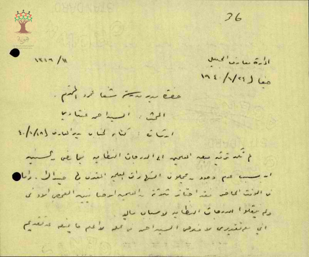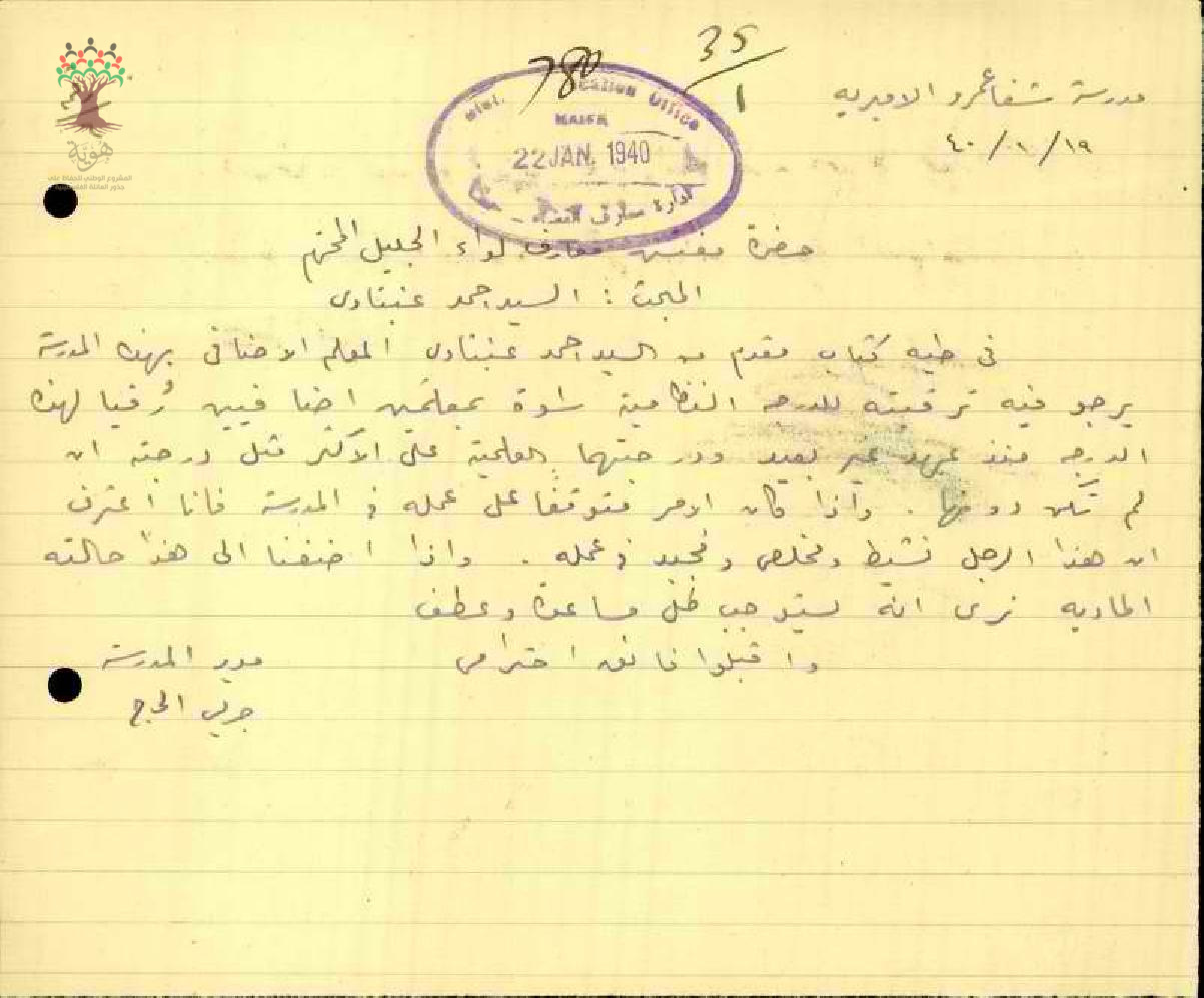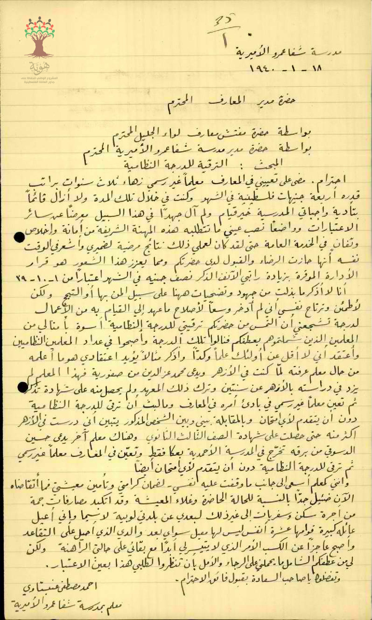 رسالة من المعلم أحمد عنبتاوي إلى مفتش المعارف يطلب الترقية للدرجة النظامية