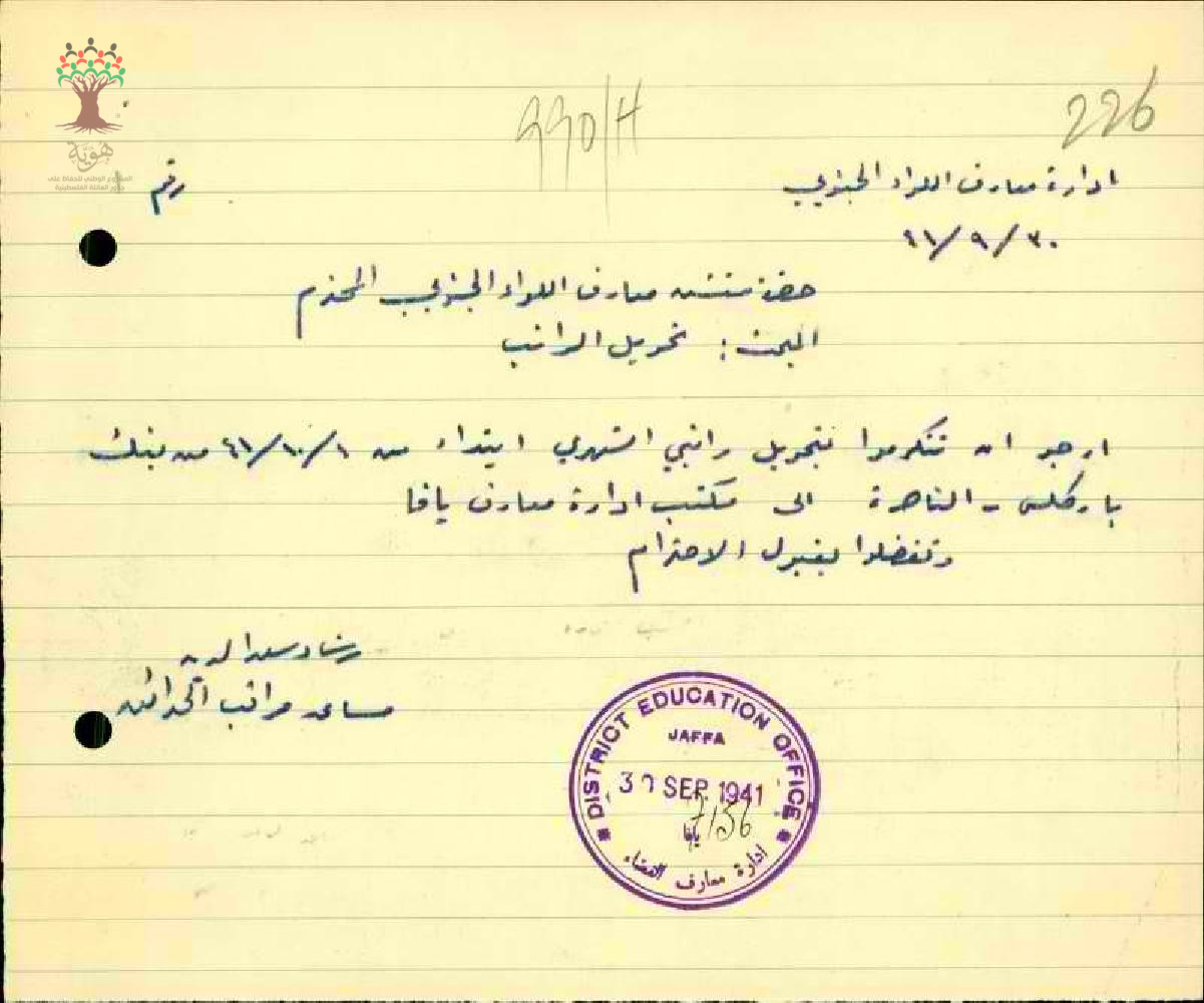رسالة من مساعد مراقب الحدائق السيد رشاد سعد الدين إلى مفتش معارف اللواء الجنوبي بخصوص تحويل الراتب