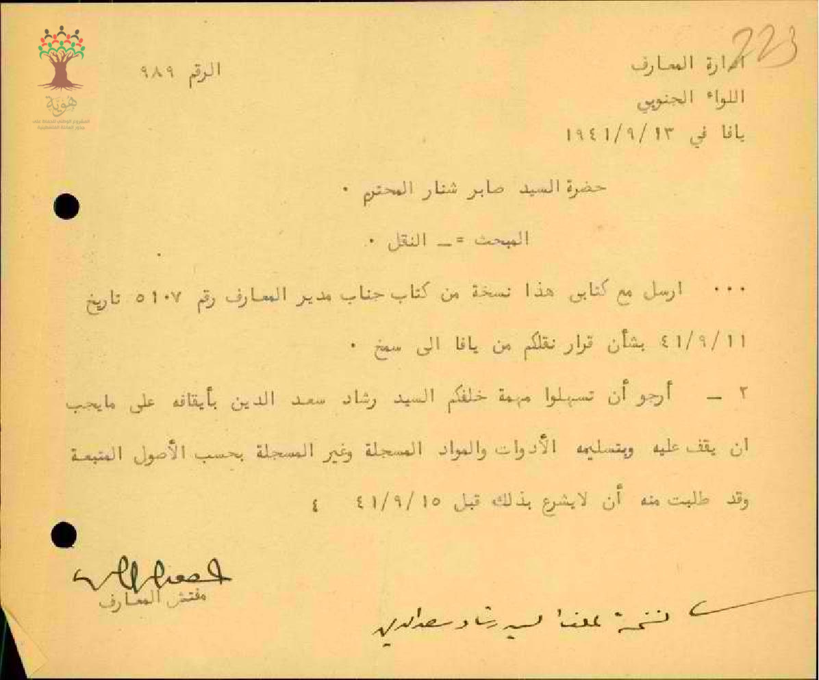 رسالة من مفتش المعارف إلى حضرة صابر شنار المحترم بخصوص النقل