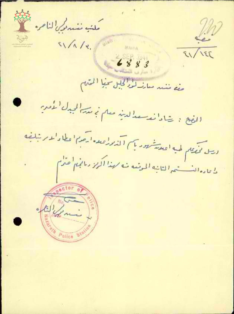 رسالة من مكتب الناصرة إلى مفتش معارف لواء الجليل بخصوص معلم مدرسة المجيدل الأميرية السيد رشاد سعد الدين طي إعلان بإسمه