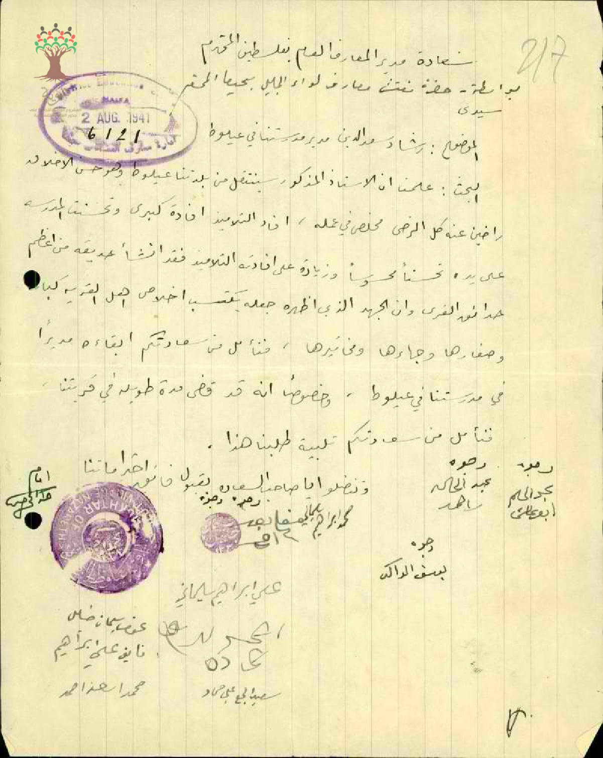 رسالة من وجوه القرية إلى مدير المعارف المحترم العام في فلسطين بواسطة مفتش المعارف في لواء الجليل بخصوص نقل السيد رشاد سعد الدين مدير مدرستنا في عيليوط