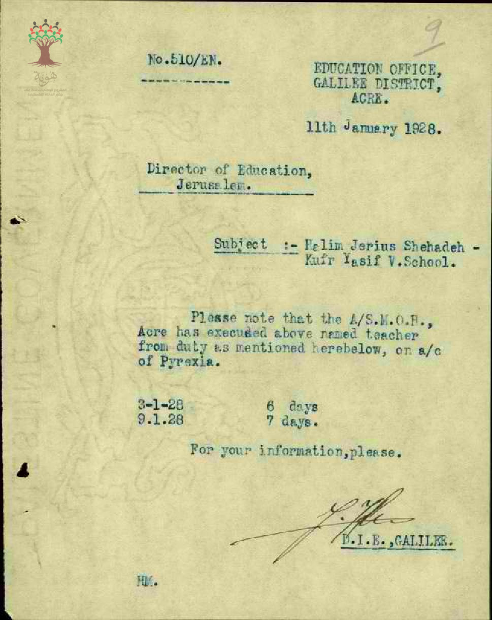 رسالة من مفتش المعارف الى مدير المعارف بخصوص تغيب المعلم حليم شحادة