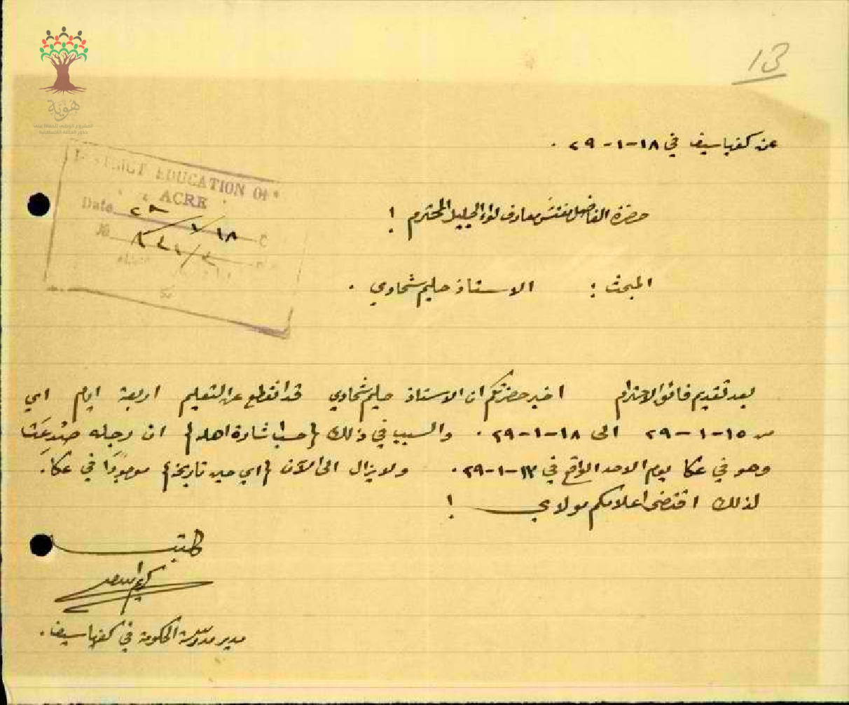 رسالة من مدير مدرسة كفر ياسيف الى مفتش المعارف بخصوص تغيب المعلم حليم شحادة بسبب المرض