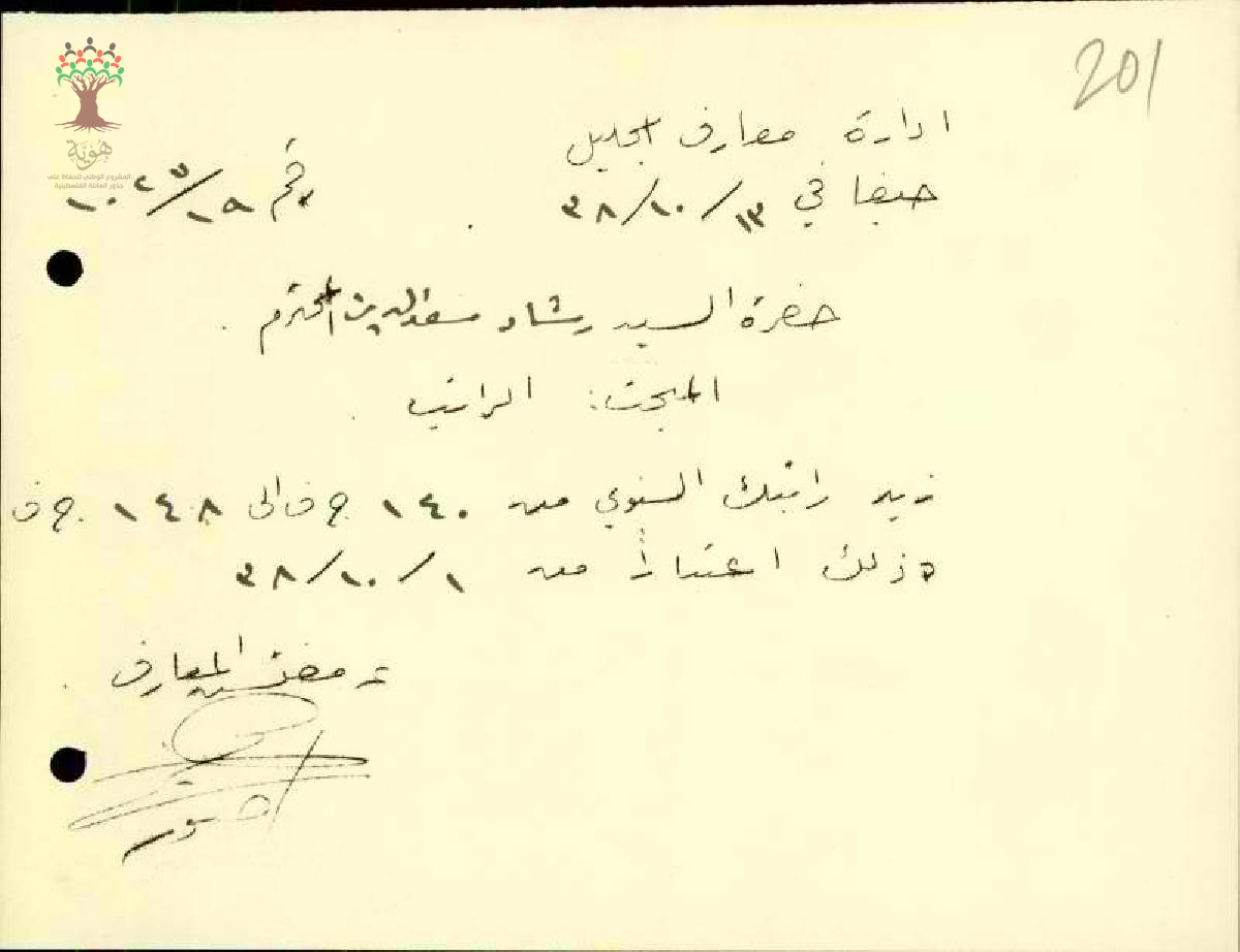 رسالة من مفتش المعارف إلى السيد رشاد سعد الدين إلى بخصوص زيادة الراتب