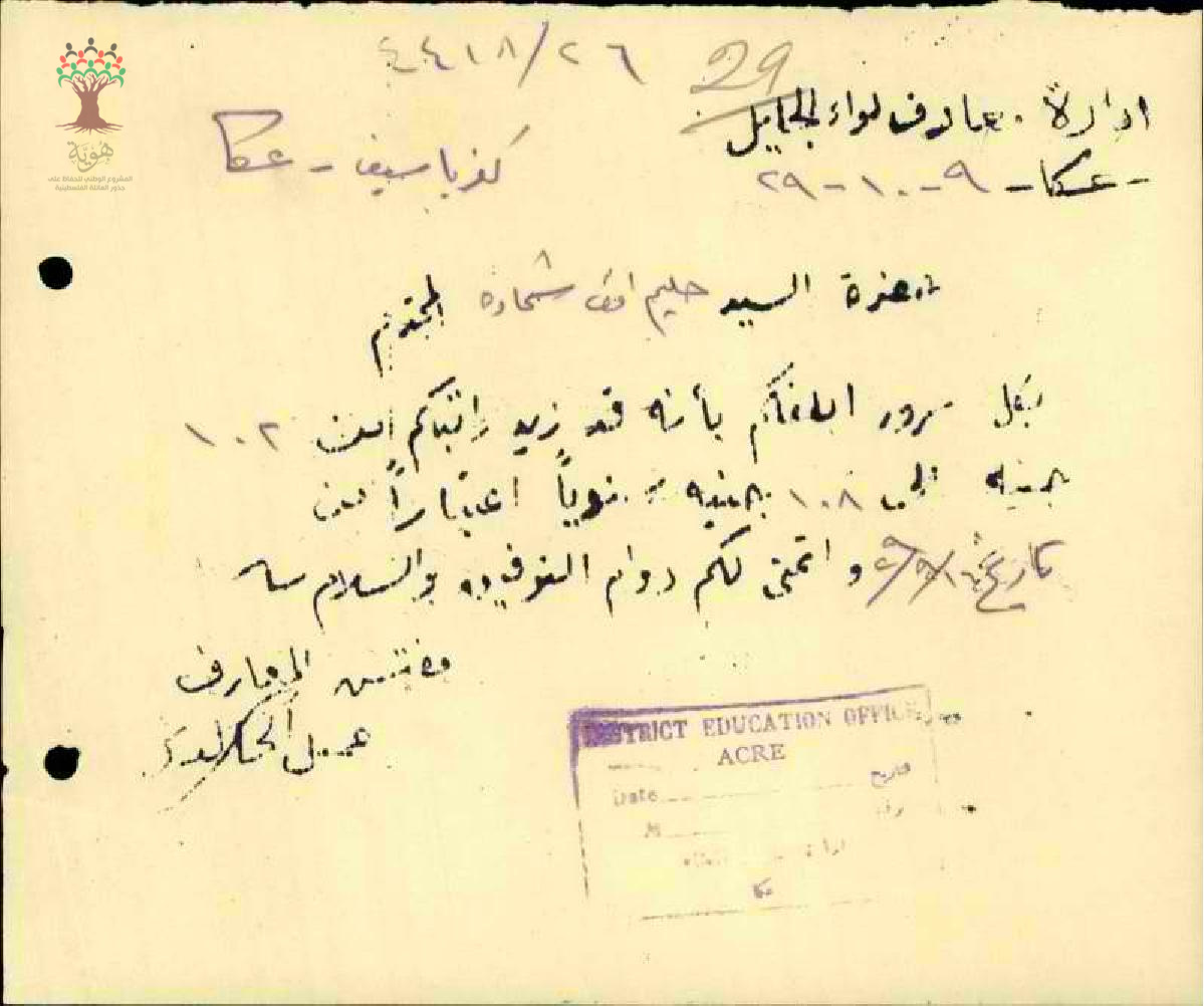 رسالة من مفتش المعارف الى المعلم حليم شحادة بخصوص زيادة راتبه السنوية