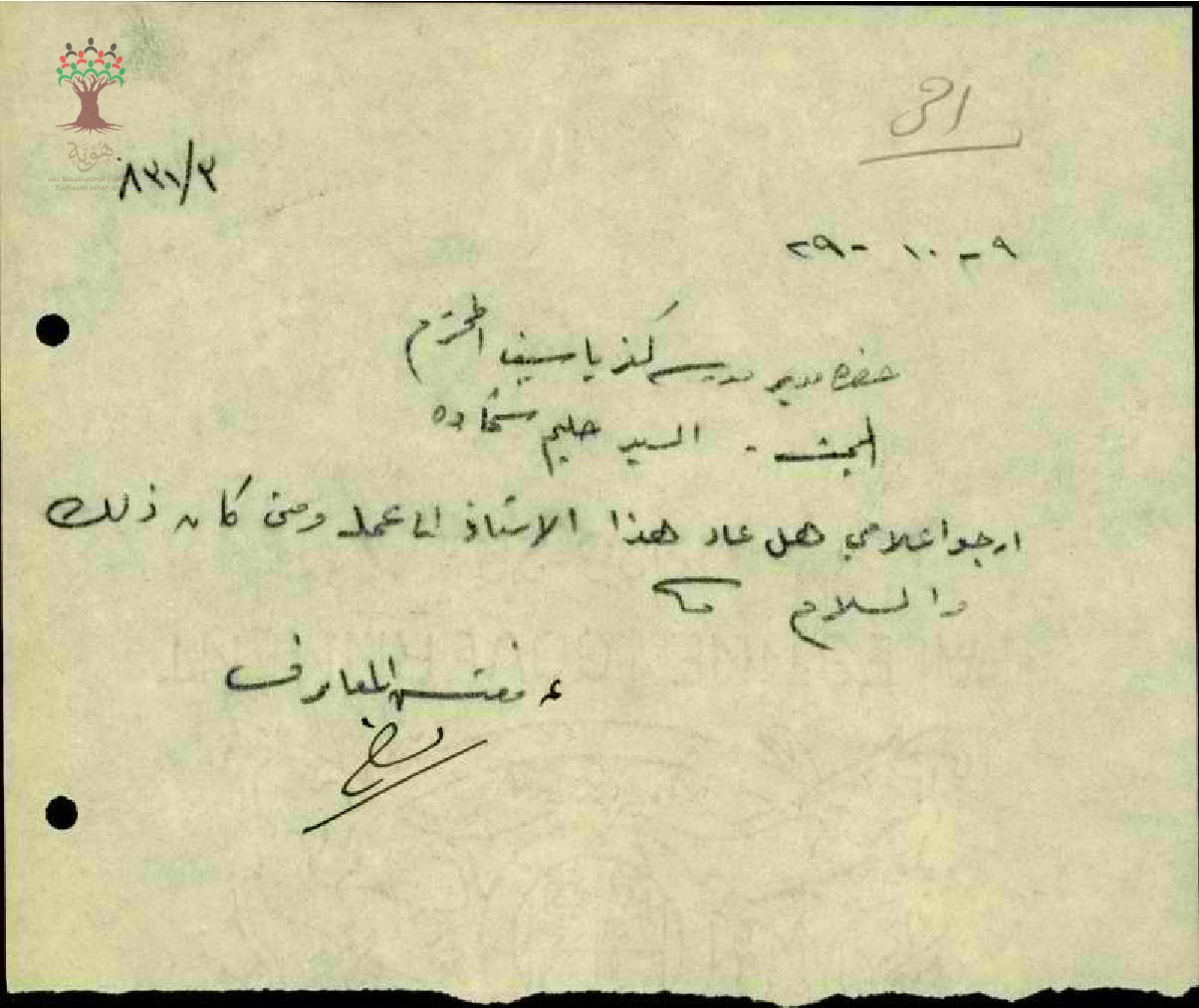 رسالة من مفتش المعارف الى مدير مدرسة كفر ياسيف يسأل عن عودة المعلم حليم شحادة الى العمل