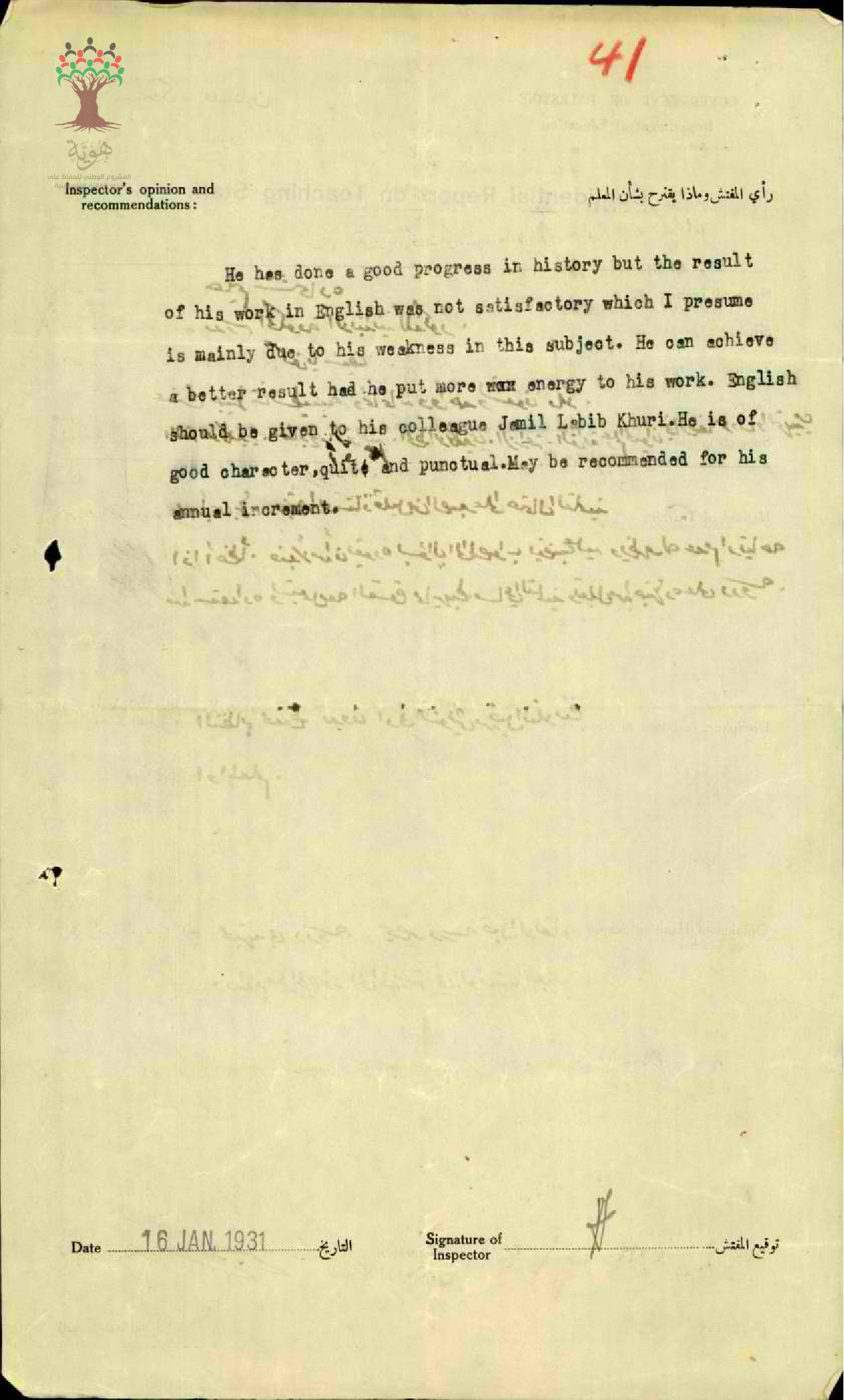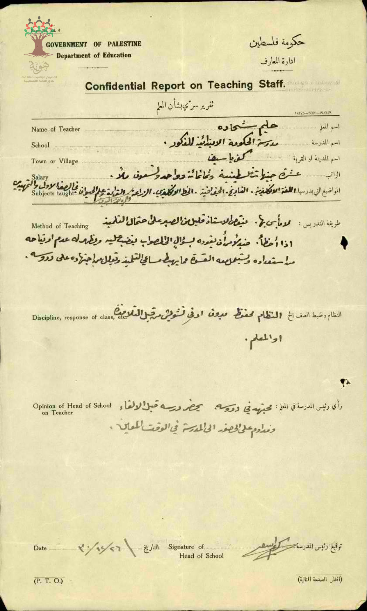 تقرير تفصيلي عن أداء المعلم حليم شحادة في مدرسة كفر ياسيف سنة 1930