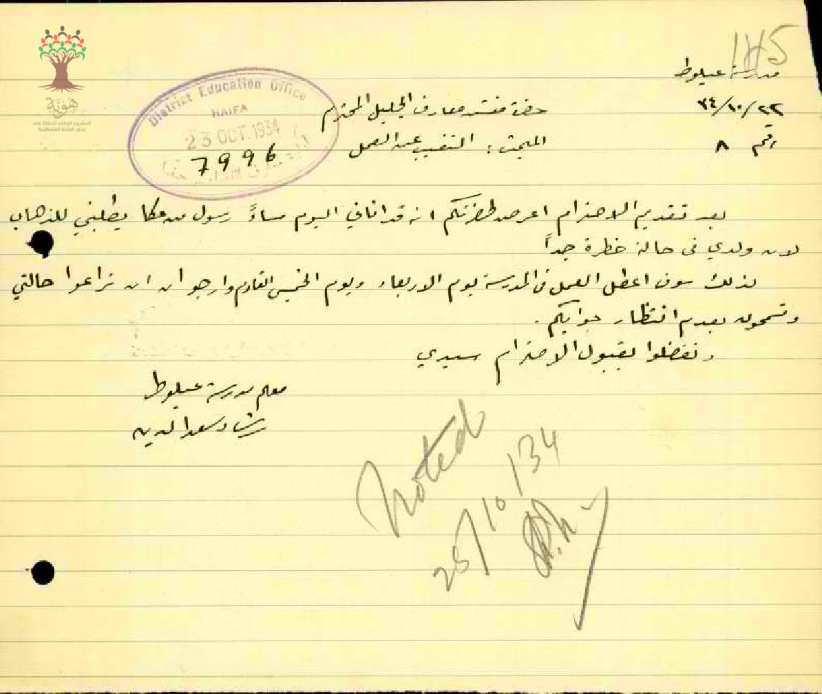 رساله من المعلم رشاد سعد الدين الى مفتش معارف الجليل بخصوص التغيب عن العمل