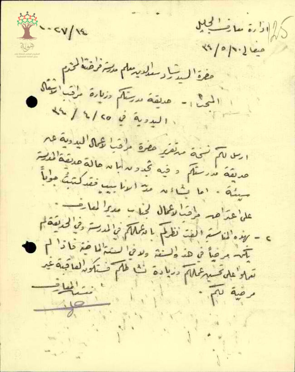 رساله من مفتش المعارف الى المعلم رشاد سعد الدين بخصوص حديقة مدرستكم