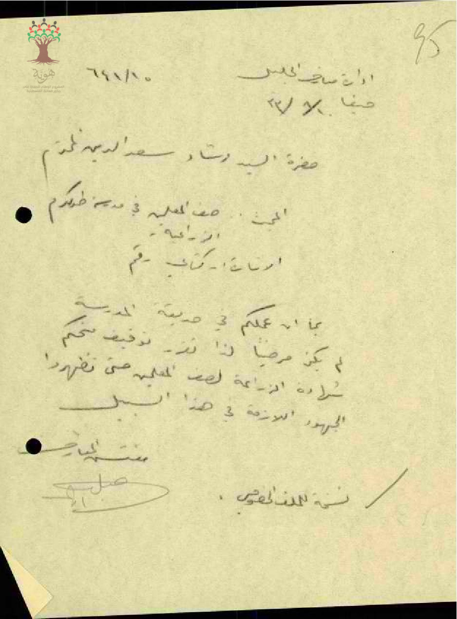 رسالة من مفتش معارف الجليل إلى حضرة السيد رشاد سعد الدين بخصوص صف المعلمين في مدرسة طول كرم الزراعية