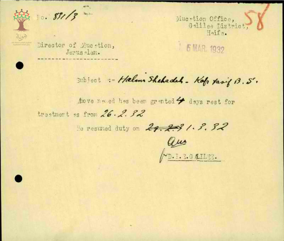 رسالة من مفتش المعارف الى مدير المعارف بخصوص تغيب المعلم حليم شحادة وعودته الى العمل